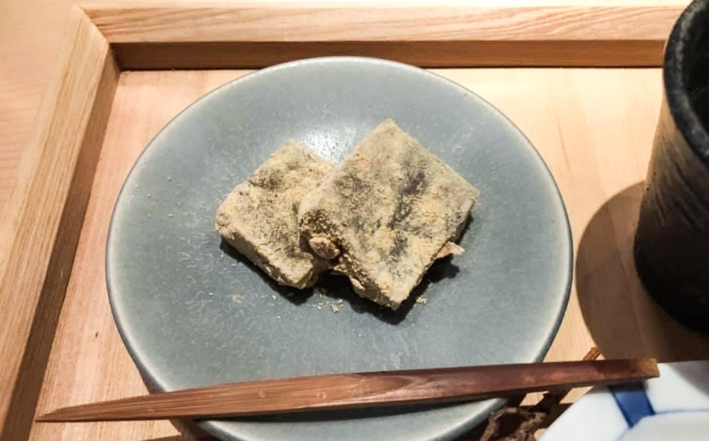 自製的蕨餅,真的如在日本玩時臨時跟路邊攤日本阿嬤買的蕨餅滋味雷同,但脆,軟甜,微脆,黏甜而可口,尤其花生粉。搭清酒,前味覺均衡剛好,但尾韻有激辛感。