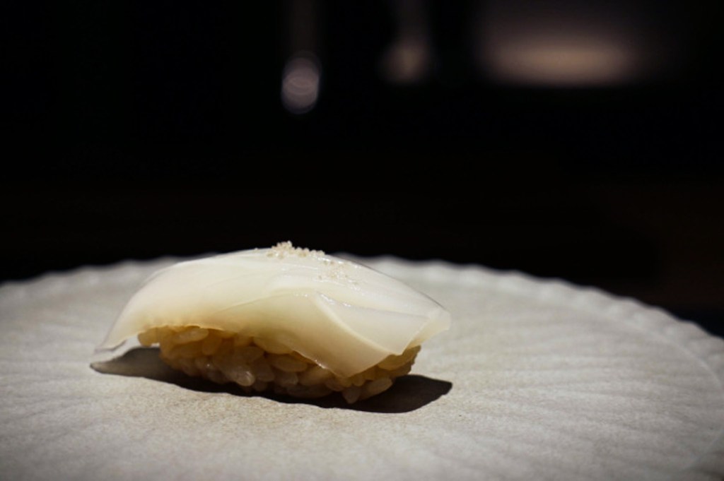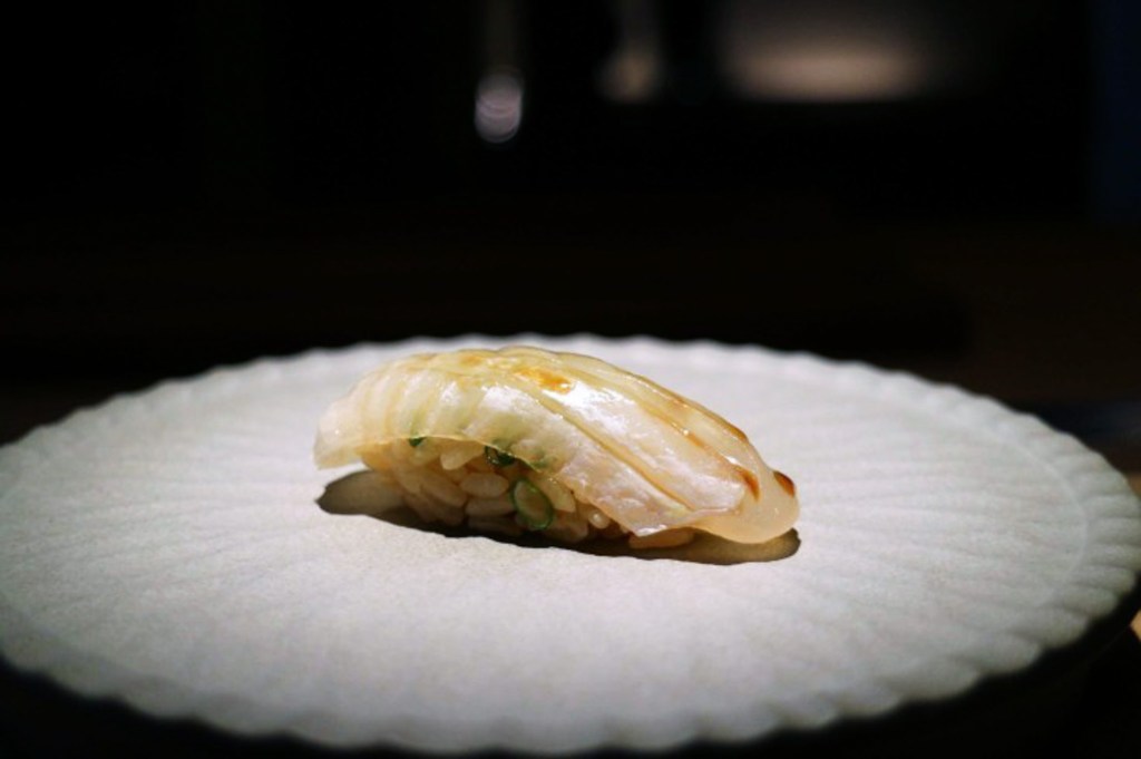 第三貫握壽司是三重縣的墨烏賊製捏握的壽司。這貫外層一如生食烏賊那樣的外層,是稠潤黏香滋味,而中間感到脆口,再接著於口中有感受到醋飯溫度還有微微顆粒感,而添加的柚子鹽更增加香氣與滋味。搭配純米酒,欸…,這是特別的香純,是酒的溫度適當,還是與墨烏賊以及柚子鹽的碰撞呢?整體是甜潤甘口,尾韻甜香而舒服。