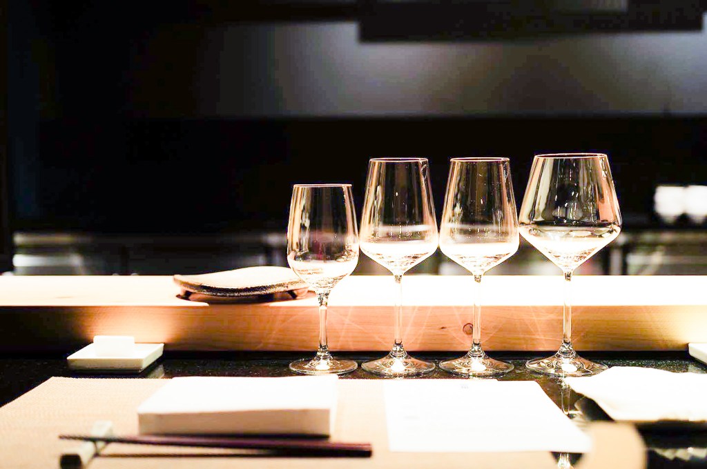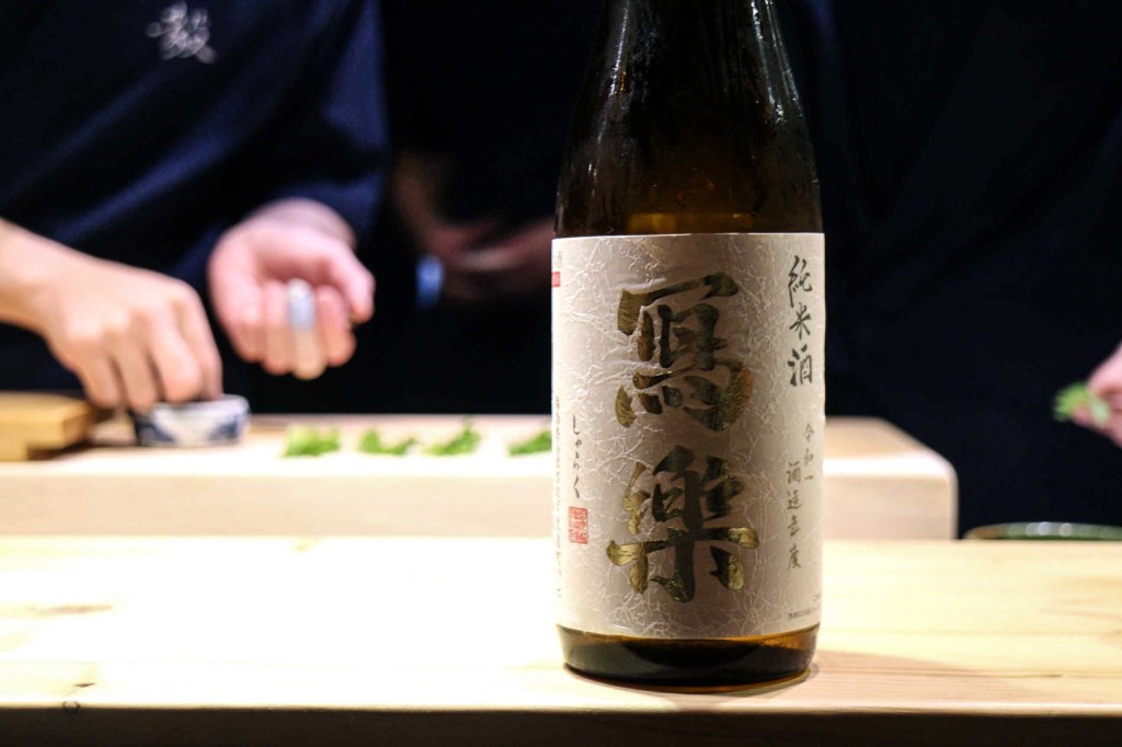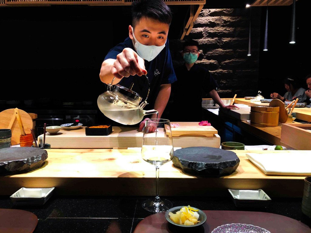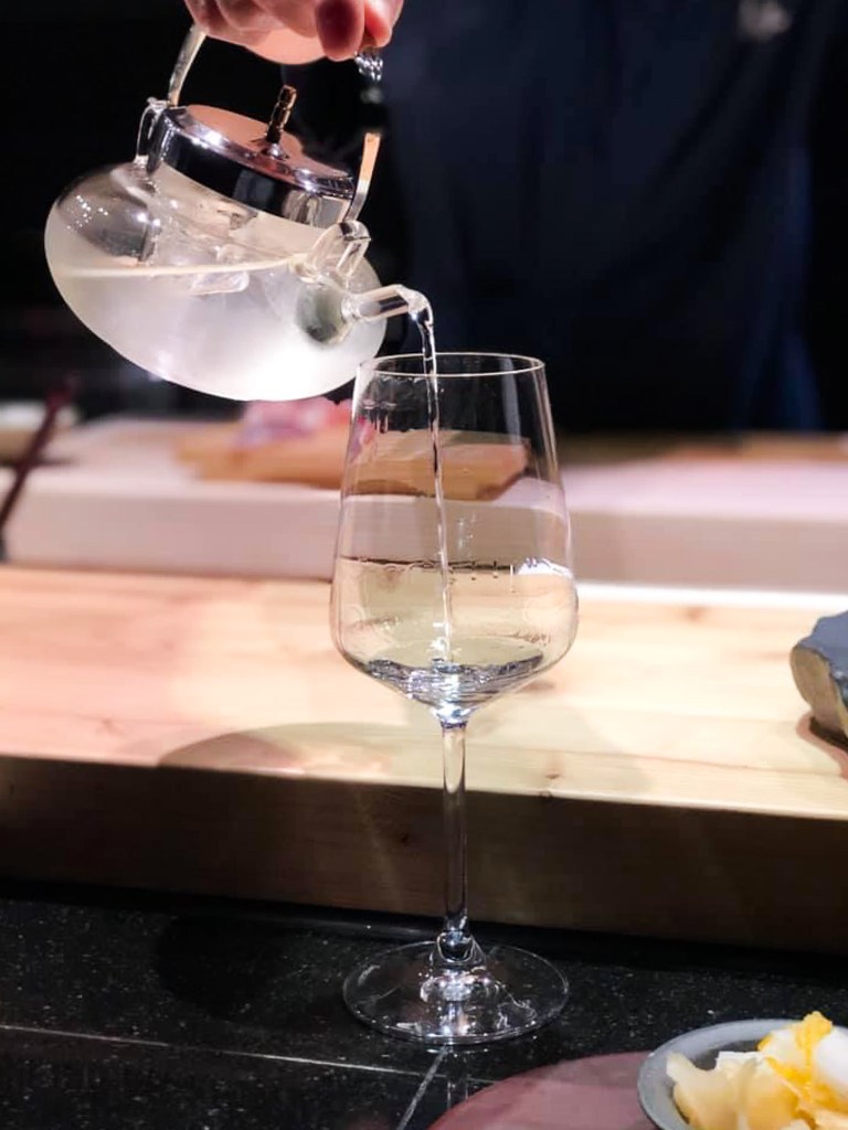 對的,今天帶的清酒是「寫樂純米酒」(精米步合:60%,米種:夢の香)。餐廳是以一款透明中間製冷的茶壺作為斟酒工具,而在杯子的部分,我先告知了服務人員,幫我準備白酒杯即可。