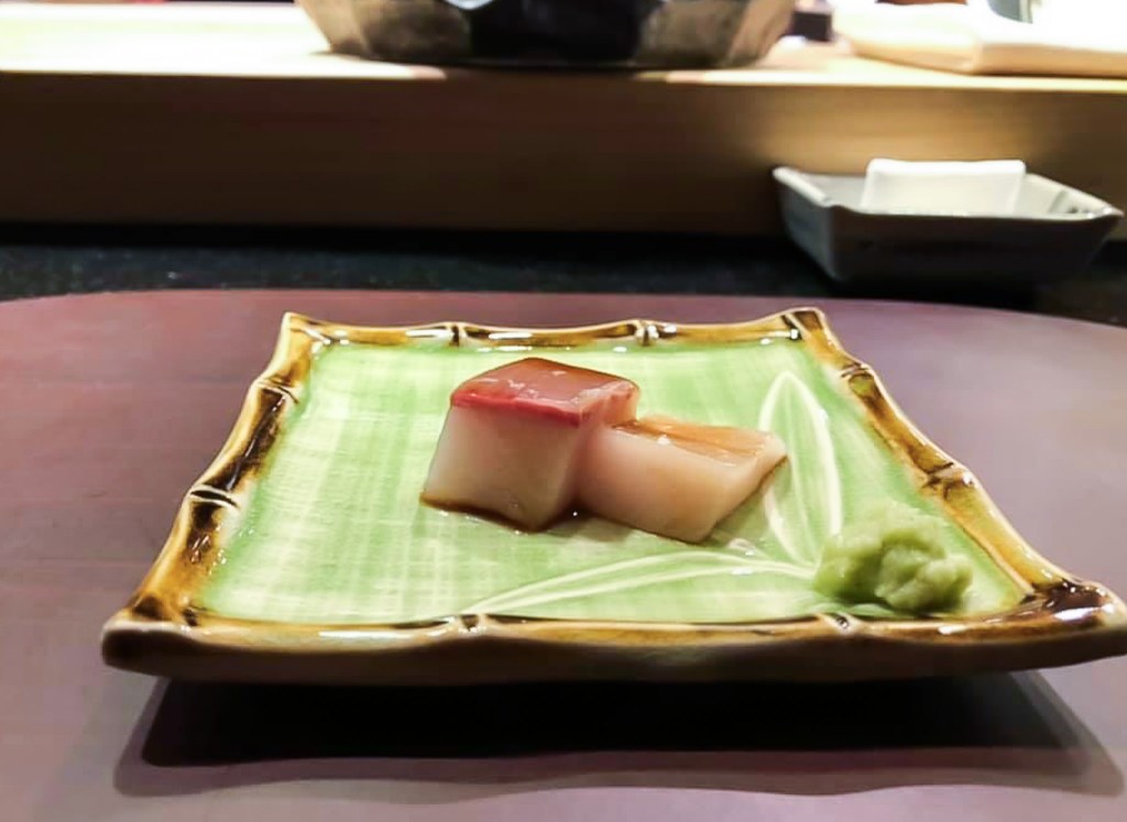 確實,師傅第三道來個烤物,是經過稍微烤過的小小隻螢烏賊且添上香料。我咬下,帶著微溫口感與飽滿滋味,同時也感受軟嫩馨香,尾韻稍稍有烏賊的海味。搭配純米酒,一開始便表現鮮香海風味,直接到尾韻激起鹹腥味。