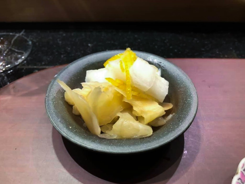 接著服務人員送上了一碟「醃漬蘿蔔與壽司薑」,看來是下了一道握壽司的預備命令了。