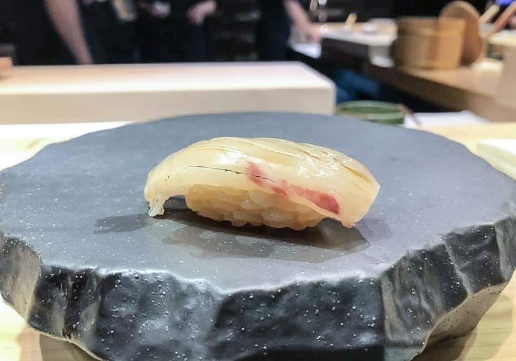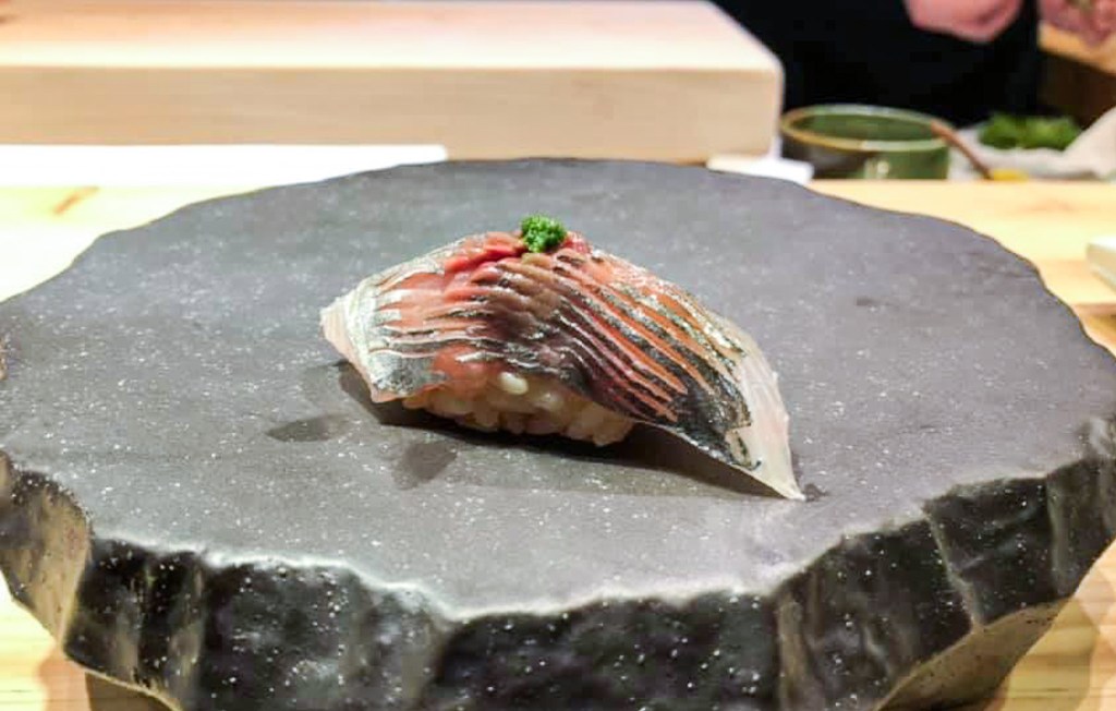 此時,進來用餐的人越來越多了,我也獲得稍稍喘息的機會可以回味一下剛剛的美好,不過餐廳的出菜次序井然,也不會耽擱太久,而第七道的「竹莢魚握壽司」便從師傅涅握後登場。
