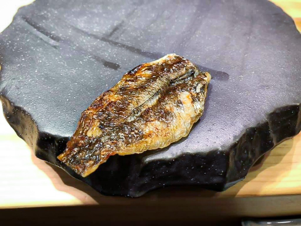 連續兩道烤物,而這道鯛魚下巴的滋味真是甘美鮮香,外層魚皮鎖住魚汁,叨夾起魚肉入口,鹹湯流露,不焦而滋味纖細,這道好吃。加上有點酸濃鹹味的蘿蔔泥,由於冰涼而多了層次感,但配上下巴肉仍那麼美好可口。搭配寫樂純米酒,可謂好吃好喝,美好搭配。儘管會有些魚市場腥香刺激感,但僅一秒短暫,而回甘甜口可口滋味持續許久。