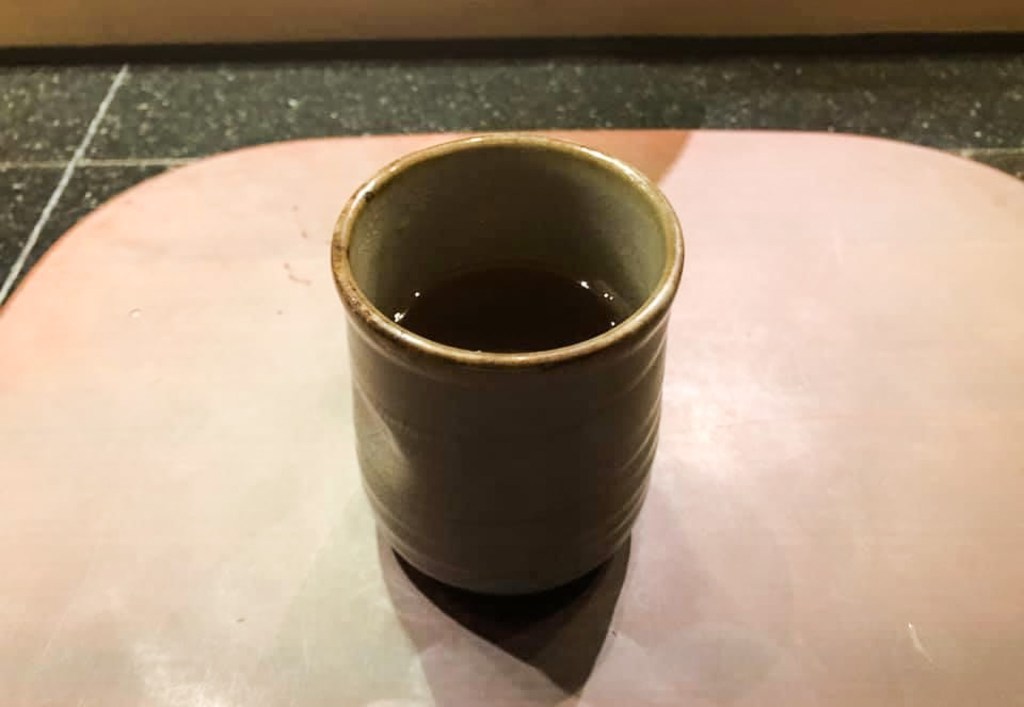 入座時,溫毛巾,熱茶也隨著置上,而我拿起了乾爽綠茶,喝了一口,除卻一下口中滋味以及溫暖的口感緩和心情。這杯茶真是順暢乾爽的,還有柔和的焙香,相當美好舒服。再飲一口,再次舒緩情緒緊張,精神突然放鬆,香口理想的開味茶。