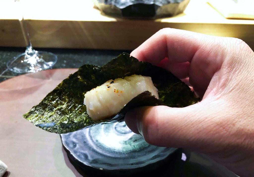 哇,這樣的調度看來是想即刻大開我的味蕾,這道用海苔夾著厚實炙燒過的干貝,我一口咬下便爆了汁,微脆的海苔以及鮮美甘甜多汁的干貝,真是美味十足。當然,一不小心海苔就會軟了,所以最佳的吃法是迅速快速,稍微等待的第二口就沒那麼微脆感,但這道的風味真是過癮。搭配寫樂純米酒,入口微辛,中味微微的辛嗆,有麴味、酵母味,不久便回了神,但又浮現出甘醇甜口的滋味。
