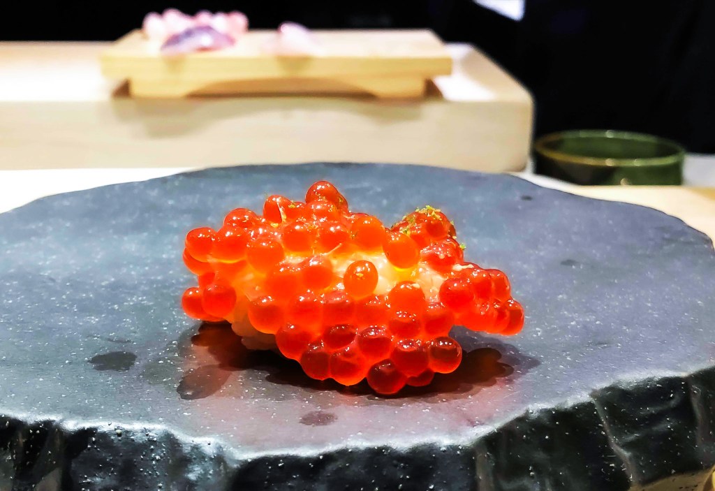 第四貫握壽司是用帶膜的「鮭魚卵」。