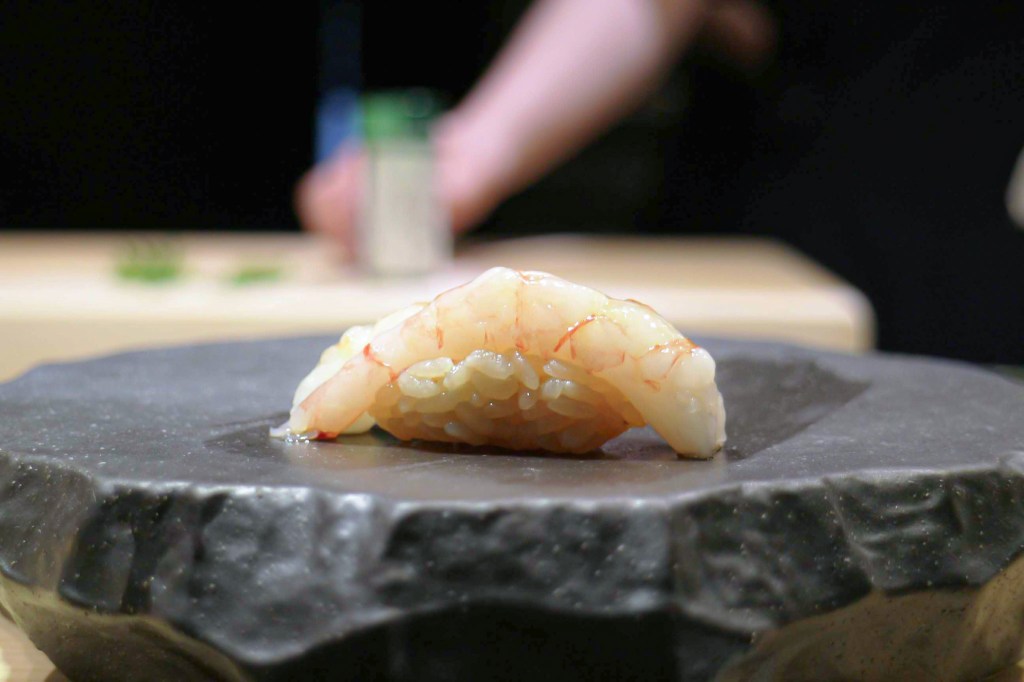 此時心想,沒想到南臺灣也有這麼好的壽司餐廳,到目前為止,還沒失望,看來眼前師傅所施展的妖術,就是我的第五貫握壽司「甜蝦」。
