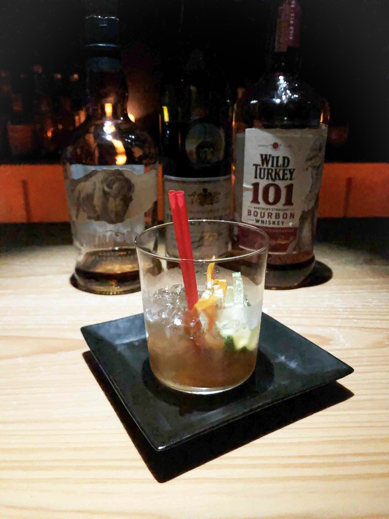 第一杯的老經典,調酒師用了Buffalo trace、Wild turkey等Bourbon Whiskey以及一款Fernet Verdini香艾酒。他注入幾種苦精,襯底是砂糖,再以香吉士與檸檬片做陪襯。特別的是插上了兩根細細的吸管。