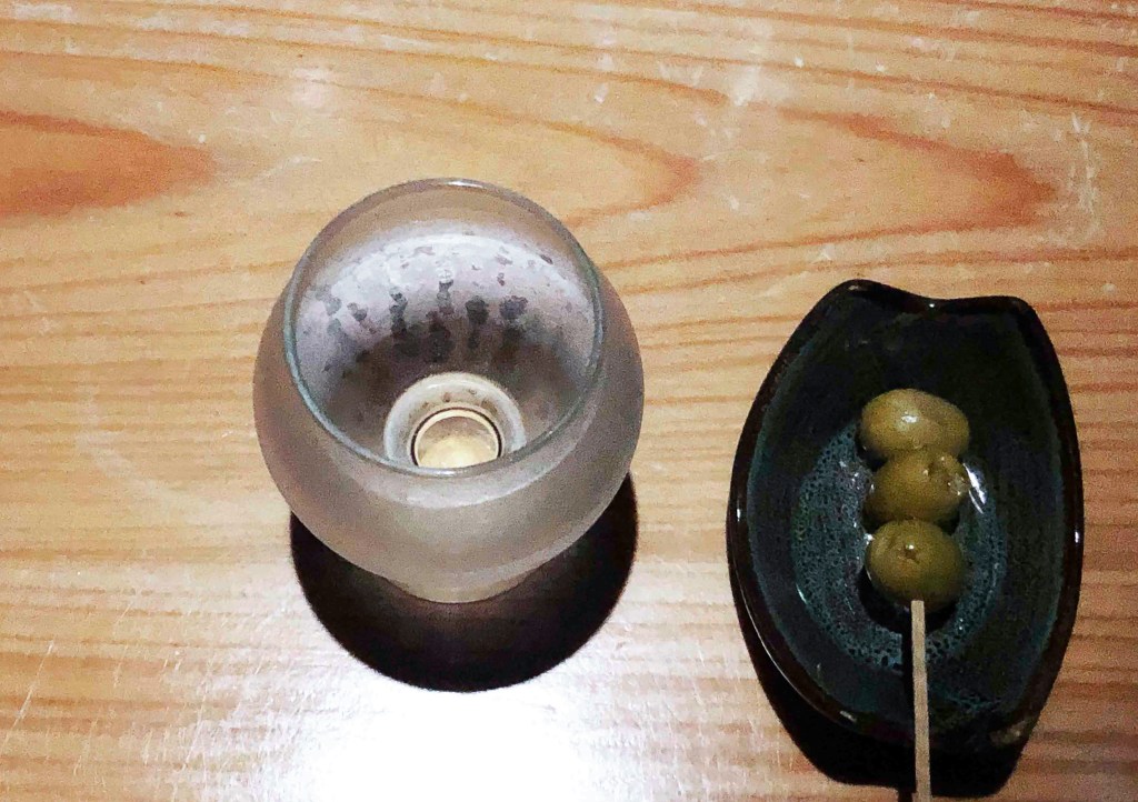 和調酒師聊著聊著,似乎都在談論美食,關於這一點調酒師個人也是十分沈醉在美食生活當中,不知不覺的,就該點第二杯了,嗯嗯..來日式酒吧,怎麼可不試試Martini呢?「Martini」(Gin、Vermouth、Pickled olives)。