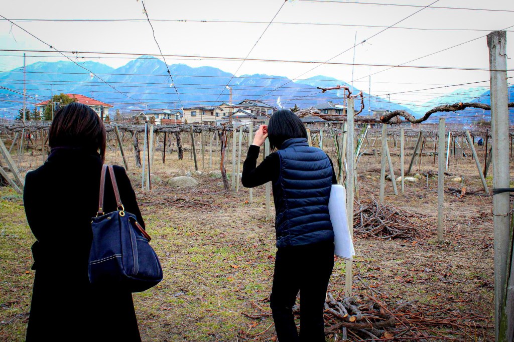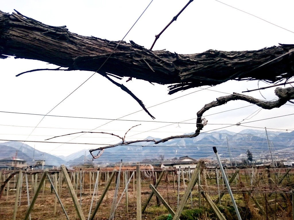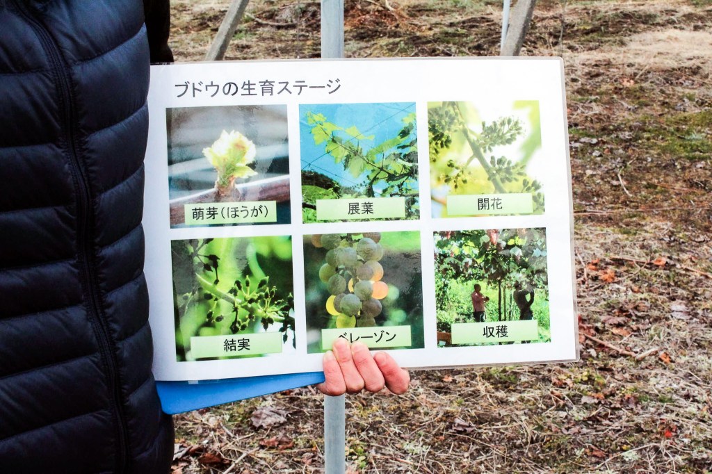 第二步,島田小姐介紹甲州獨特種植方法。她說甲州種的生長週期大致在2~3月為剪枝階段,也就是今日所來到的這個時間點。島田小姐解釋了我一到勝沼町時的疑問,為何會可處處所見山邊有燒材的煙幕?她說,這是因為此時為剪枝期,因此山梨縣勝沼町各處可看見燒枝的現象。
