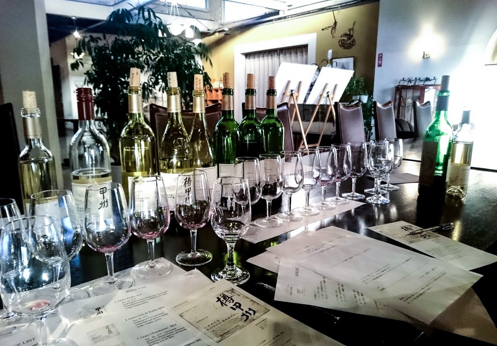 原來在等待時,酒莊裡的長桌上完成了許多試酒杯的擺設,這些就是品酒要使用的。島田小姐的所安排品酒的順序,是讓我們依色澤由淺入深,口感由薄至厚,由清淡至粗曠,感受有層次的甲州葡萄酒體驗旅程。