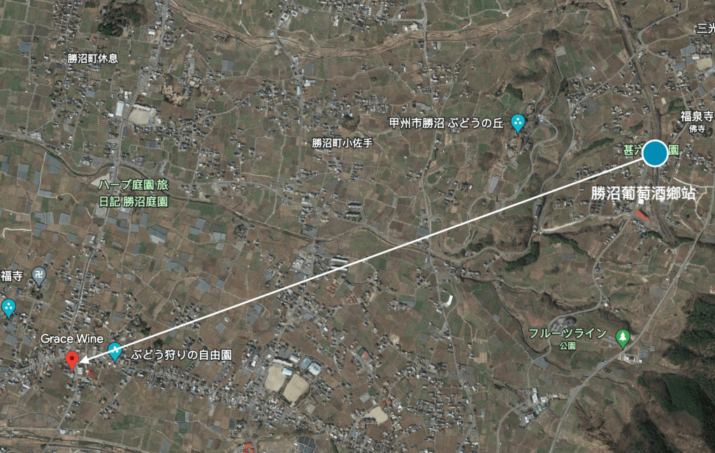 中央本線下行勝沼葡萄酒鄉站→(CO36, Katsunumabudōkyō)→🚗Grace Wine中央株式會社(35.67N, 138.71E)。