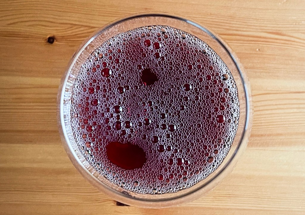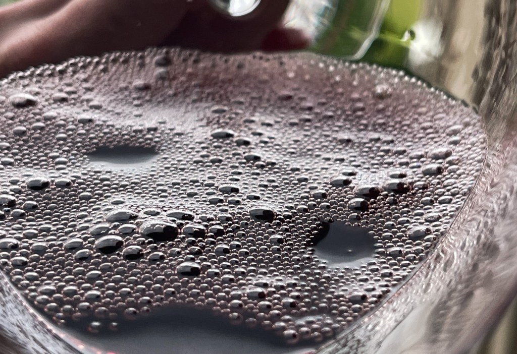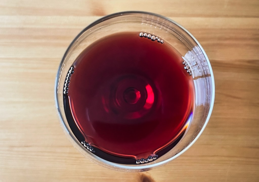 再深聞吧,感到有紅櫻桃、小紅莓的亮麗清香,我搖晃酒杯再聞,又有點礦泉味、礦泉感,但又飄出一些黑櫻桃、桑葉、皇宮菜葉的氣味,整體仍然清新舒適。
