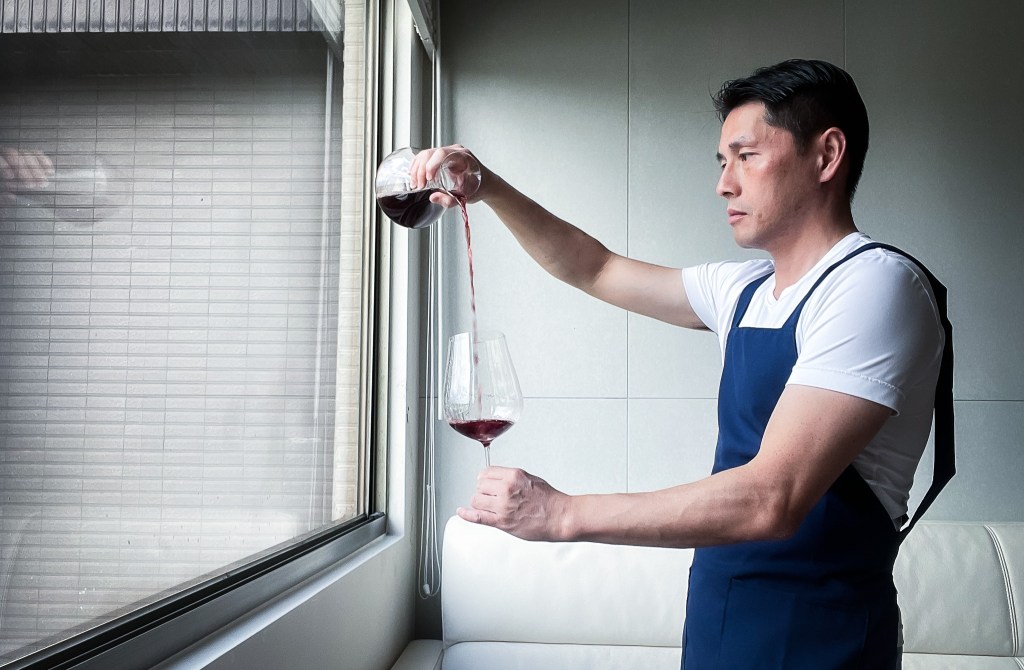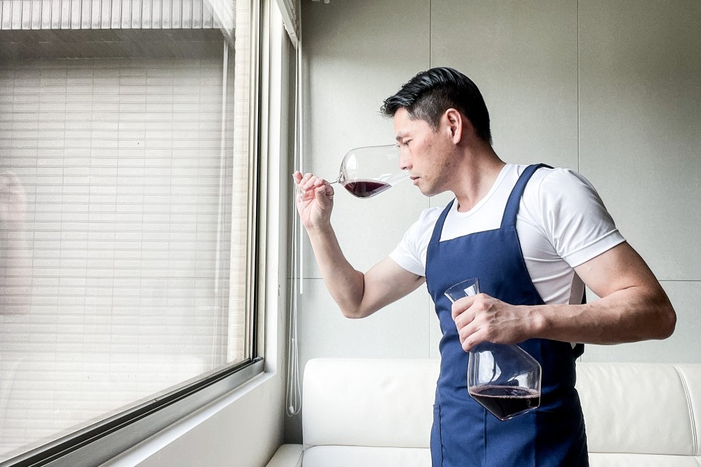 今天穿著剛網購來的藍色工作群,除了是對“大熊餐廳”影集的熱愛,同時也來一件一樣色調素雅形式的工作服也算是一種致敬方式。我拿出了酒刀,順著酒瓶源頭割開錫箔,然後起出軟木塞,興奮地準備品飲。
