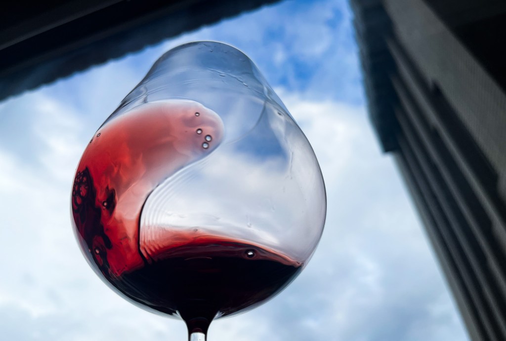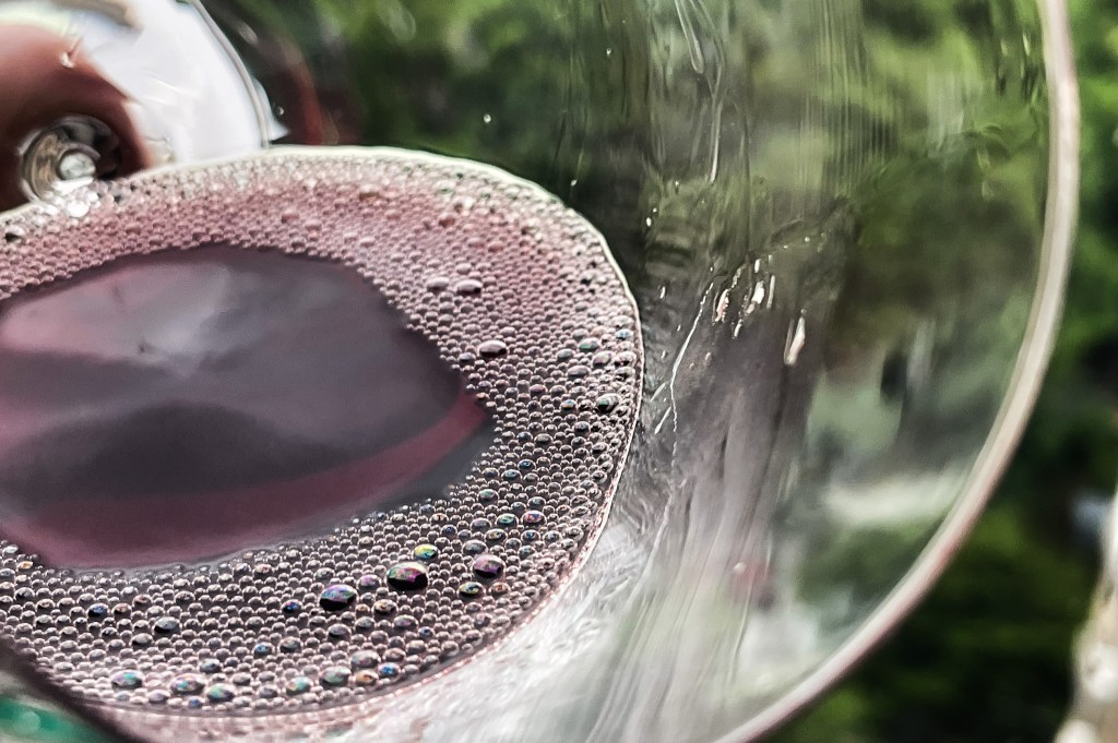 我搖晃酒杯,那種俐落的乾淨的,美麗的桃紅與寶石紅相間的色調與酒腿甚是迷人,酒腿緩緩而落,俐落優雅的進入酒面上,是一種清澈乾淨與優雅。