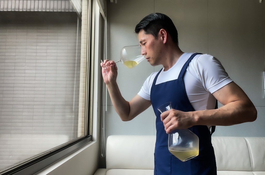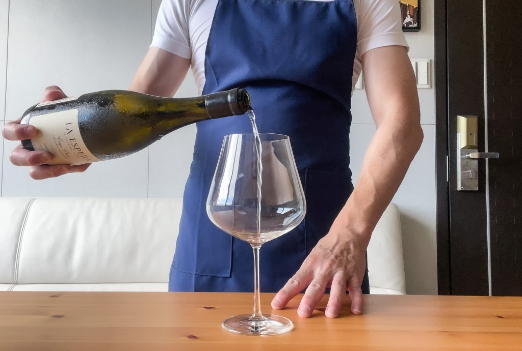 下午的天氣有點陰卻偶有明亮,在家裡吹著冷氣十分輕鬆悠閒,聽個音樂然後準備著品酒工具。我拿出了酒杯、酒刀、醒酒壺。換上輕便的內衣,戴上必秒遭酒噴灑到的圍裙,然後享受這樣的時光。