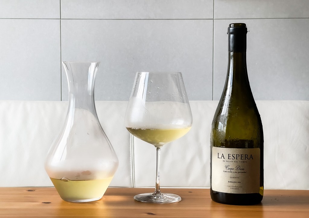 所以,過於酸澀過於岩礦感,總覺得有點封閉,所以我要醒酒。我注入半瓶Riesling進入醒酒壺,然後搖晃多接觸空氣,暫時放下等待它的變化,然後再品味醒過酒的它。