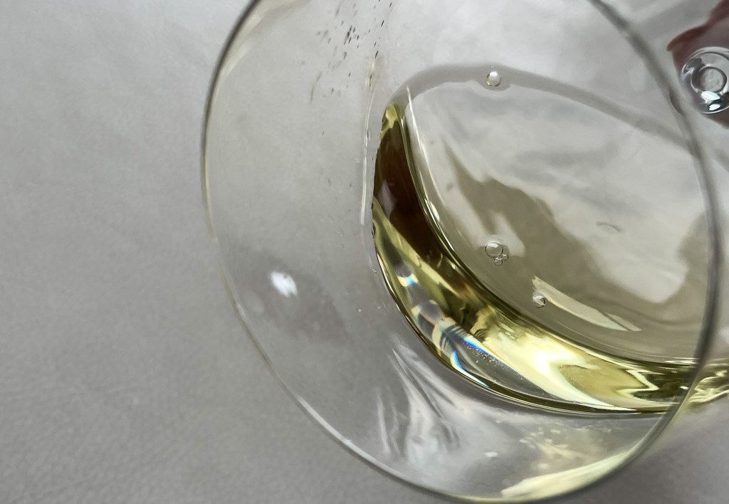 我觀看酒緣,它是透雅光澤且十分豐腴,其延伸交接酒體部分反射出銀灰色如水銀的光澤,然後帶一點山吹色、檸檬青黃色,當集中酒體時表現出青黃色調,猶如淺黃金色一般。