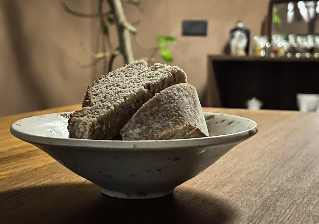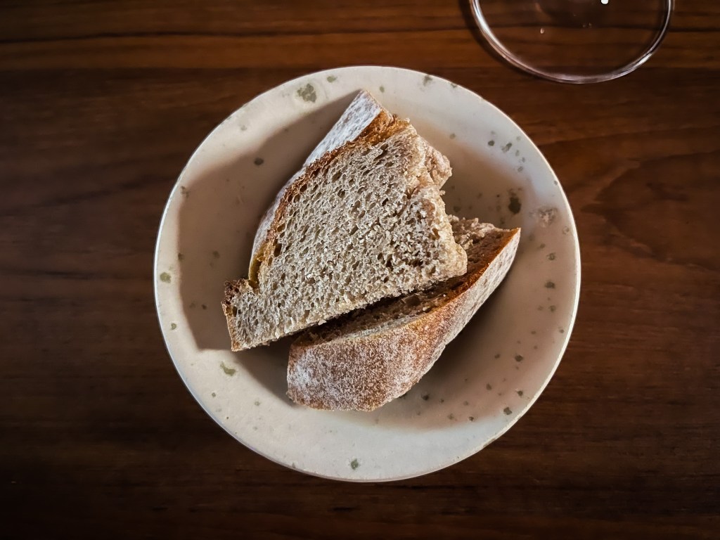 店主招待一份麵包,我想既然是酸種麵包,用來搭配葡萄酒,看看會產生什麼樣的感覺。