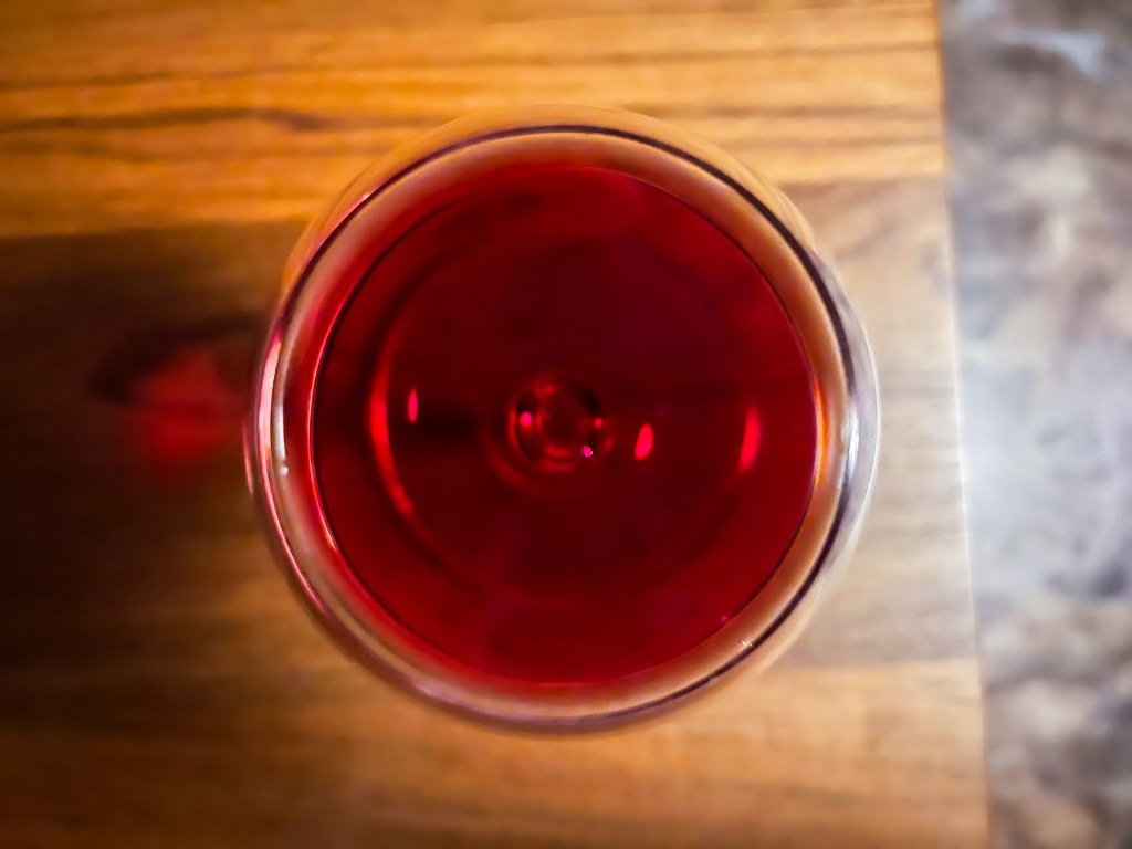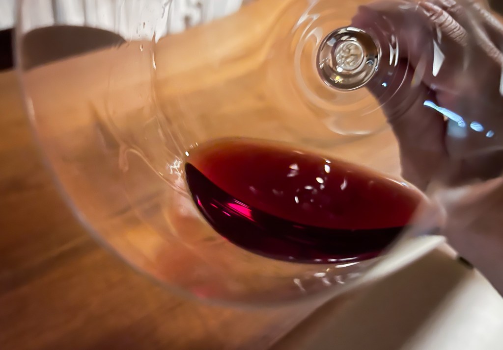 我搖晃酒杯,酒腿俐落而優雅的緩緩沿著杯腹落下,酒面平靜悠然,酒液晃動時,它的色調更如美麗瑰寶。