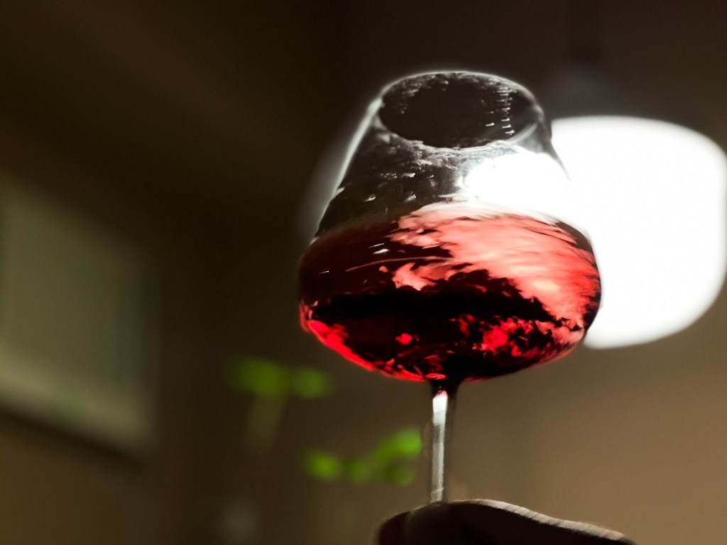 同樣從觀看酒緣開始描述,光澤豐腴曲線的酒緣,光澤而俐落,儘管昏暗燈光,我仍能觀看出交界處的淡紅與膚色,然後逐漸淡成為莓果紅再漸漸的進入寶石紅色,且在昏黃之光的環境裡,表現出紅葡萄酒的紫紅色。