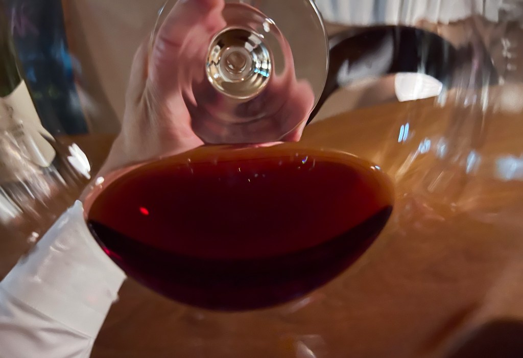 尾韻,在嘴中咀嚼,剩餘紅酒與唾液自然交融,逐漸產生一種焦甜,像莓果口味的棉花糖遇水融化的焦甜味,然後在鼻腔中產生櫻桃、紅李水果味,還有微微的綿綢感,帶著微微的甘甜酸度,尾韻表現理想。