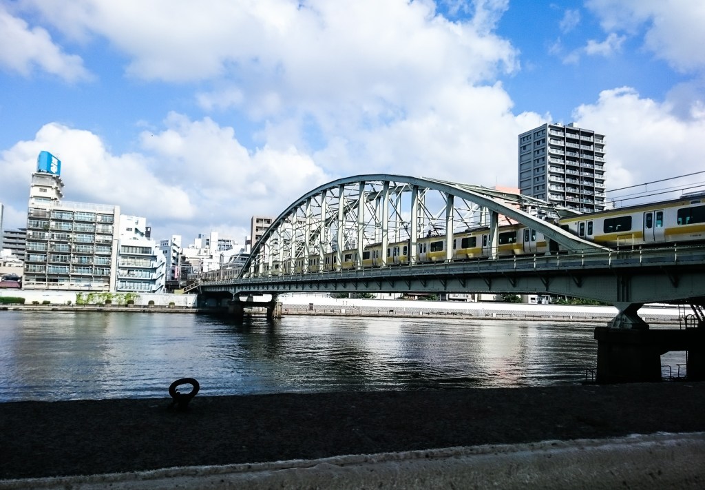 當我即將通過「言問橋」前此時已達到3公里了,而持續向下一條橋「東武花川戶鐵道橋」邁進。此時的晴空塔也落後在我的背後,這正是我喜歡而且想要的景色。當跑到「櫻橋」時,我上了河堤,並開始往迴轉,這裡是我這天跑步的轉折區,然後向兩國車站邁進。