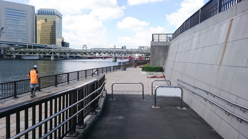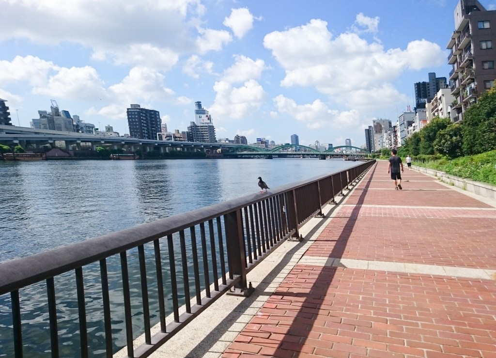 還記得第一次來東京時是搭乘遊船環遊隅田川,而回復單身後的第一次的獨自旅行,就擬定了計劃,在這裡慢跑。不過當時僅2度,非常寒冷。然而,夏日的東京,溫度相當的熱且高達34度,這與南臺灣比較則有過之而無不及。所幸,今日尚有徐徐微風,反倒不那麼難受。