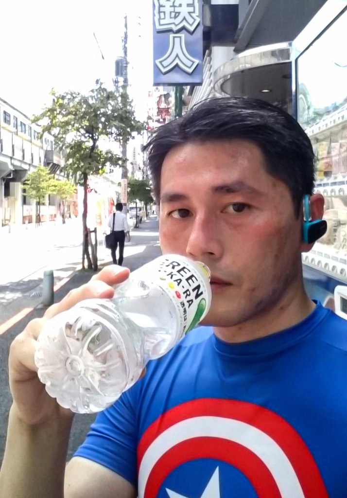 接著,我在車站拿取剛到站時寄放行李櫃取我先前寄放的物品,然後投個冰涼暢快的飲料喝喝,此時此刻相當舒適愉快。日本很方便的地方是到處都會出現販賣機,對於路跑結束補充水分是十分重要的,拿個150JPY零錢投一個運動飲料,就是我手裡拿著這一支有綠色愛心寫著Green ca-ka-ra的這一支,我超愛喝,超讚的。