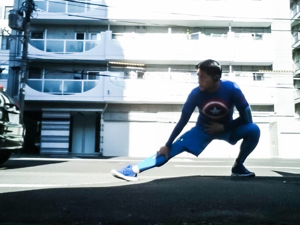 在公寓樓下做一些暖身、拉筋,因為街道路跑不比操場,有時會因為儘管路面磚塊的設計造型與凹凸,會影響跑步中的關節扭動,倘若沒做好熱身,筋太硬,有時可能會造成些拉傷、扭傷現象。
