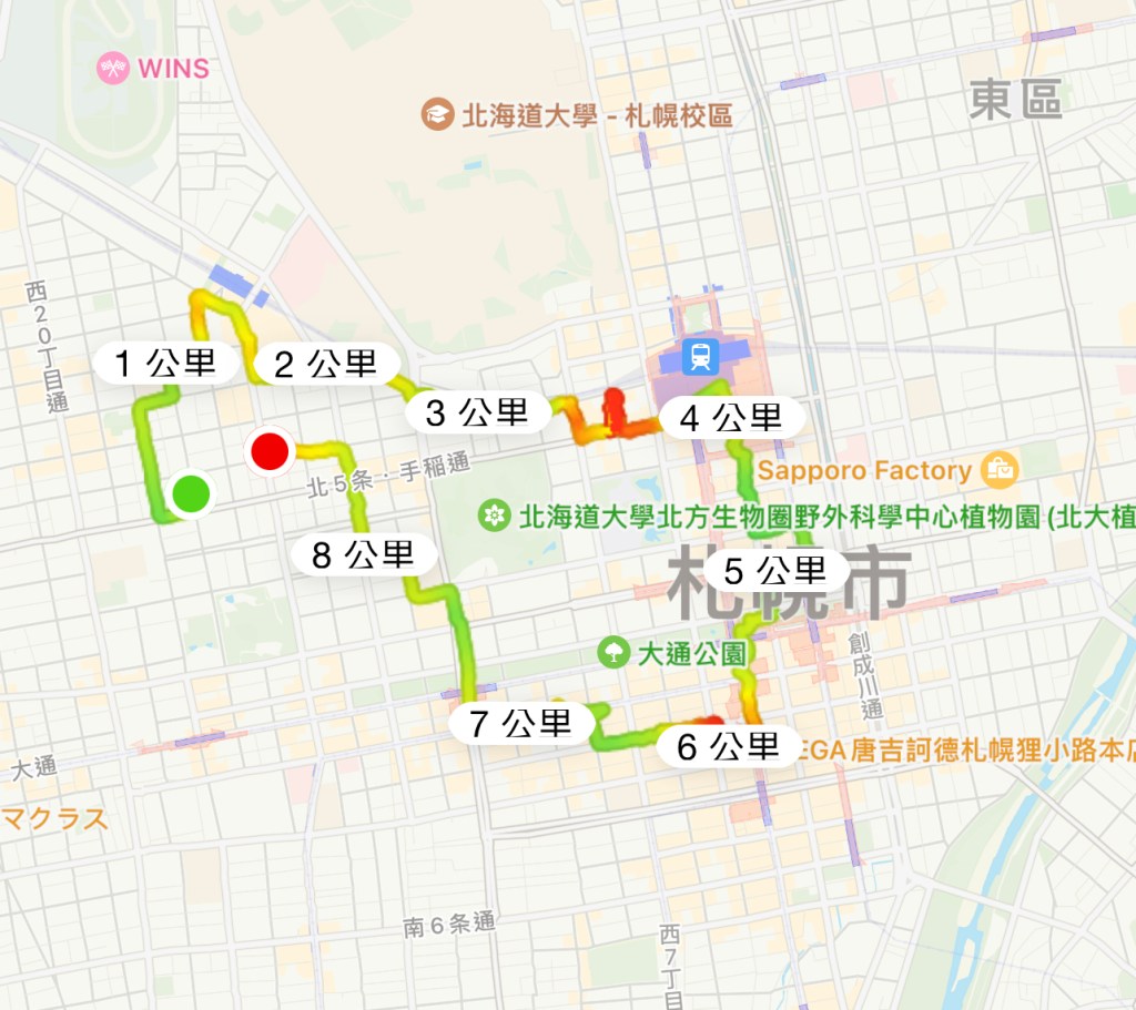 在這樣子的崎嶇路線跑了約8公里。不過也是有趣的體驗,也刻意跑過許多札幌景點,這對於沒來過札幌的朋友,我也提供了一個路線建議,就算在市區逛街也會是個指南。