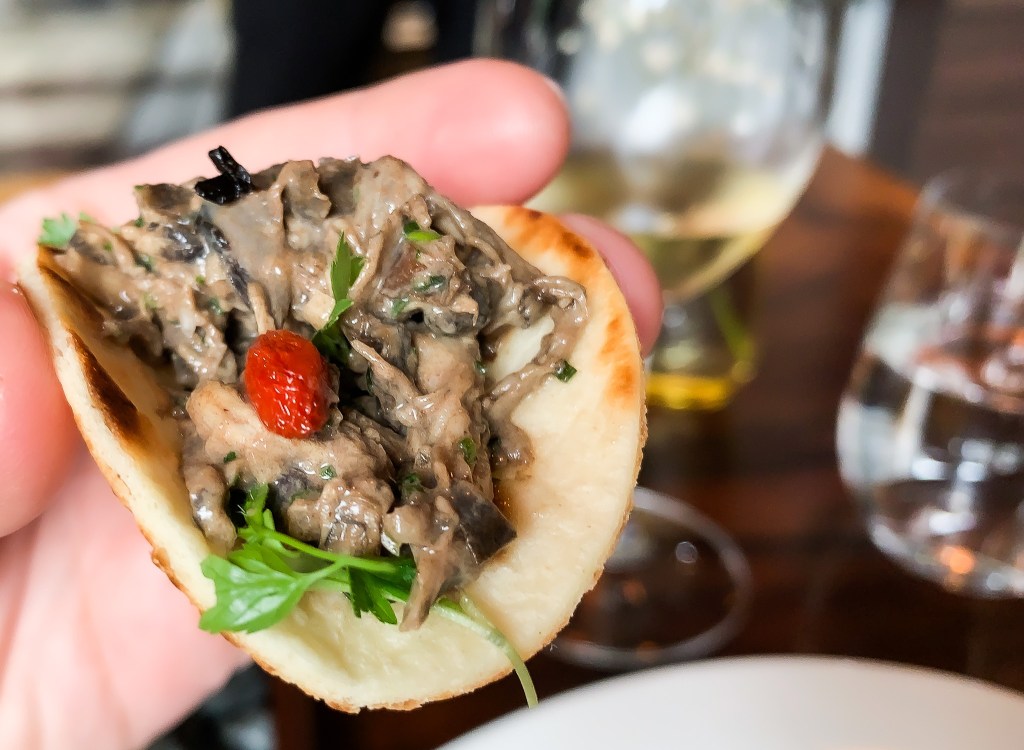 主廚這季菜單也來到黑雞入菜還有黑蒜調成美乃滋搭還有丁點蒜丁,這道做成像雞肉沙拉一樣,上方舖上一層綜合香菜還有枸杞,有點在地風格,但又弄的很墨西哥菜餚,或許是要用來搭配烤餅吧。