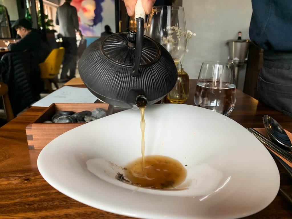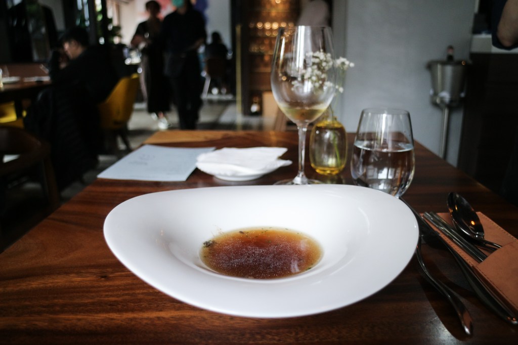 因為吃完雞肉後接著就是一種二吃的概念,既然有雞當然不浪費,主廚以雞骨與黑菜脯熬湯,色澤像極香菇清湯。