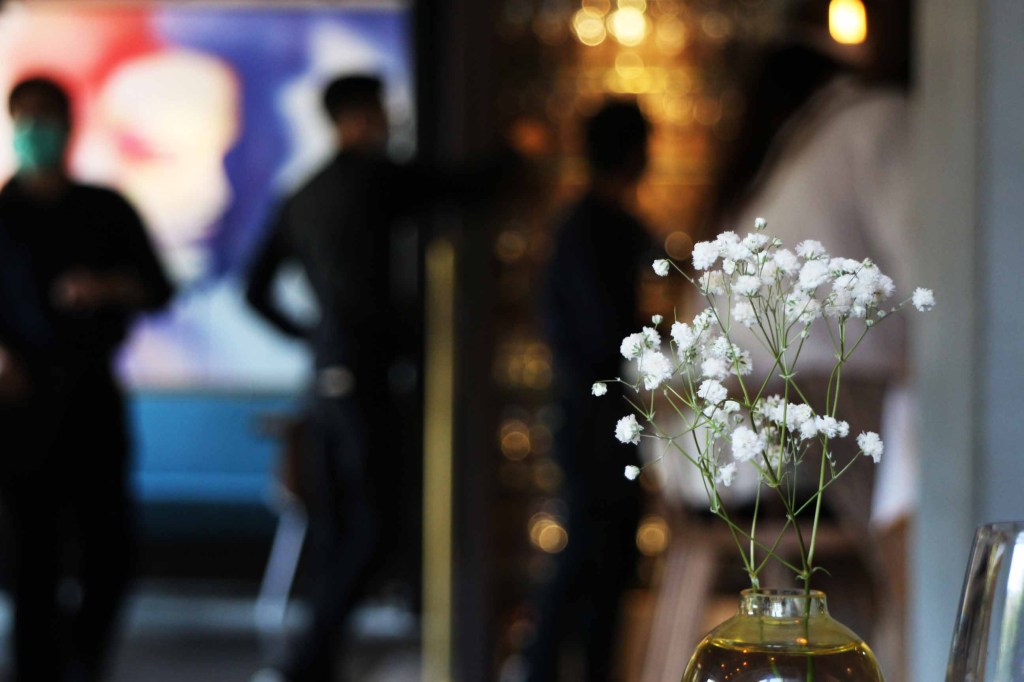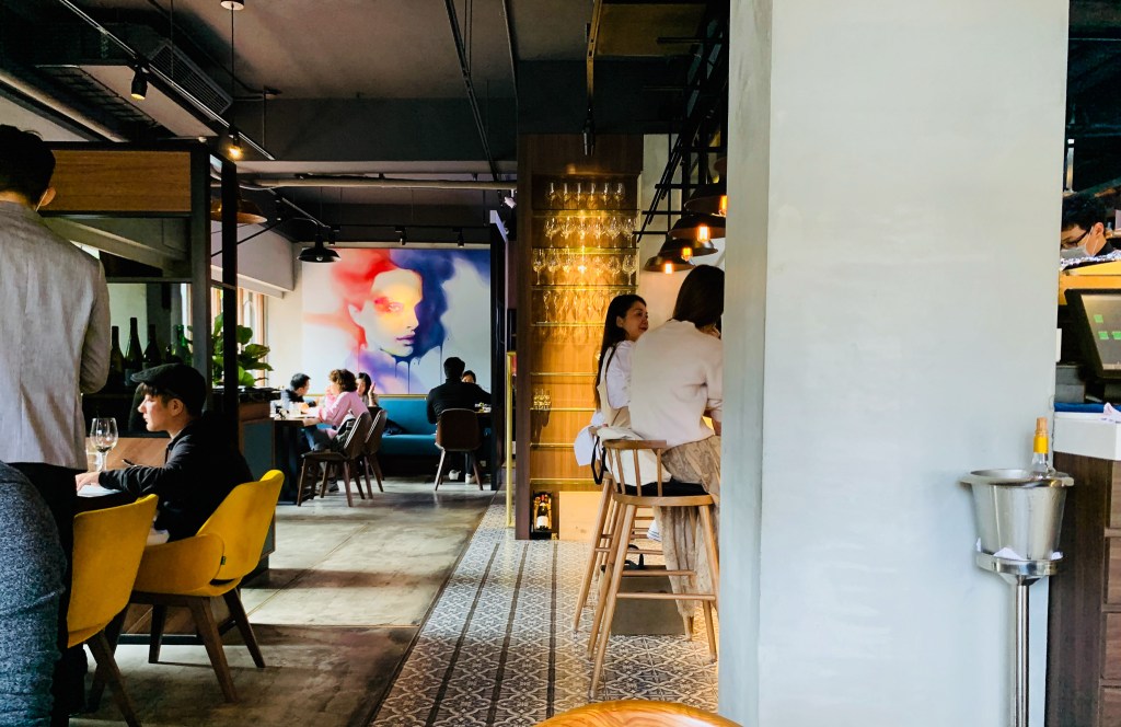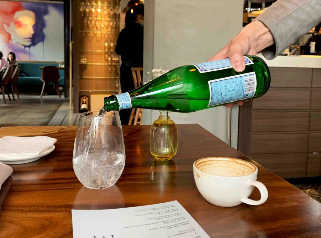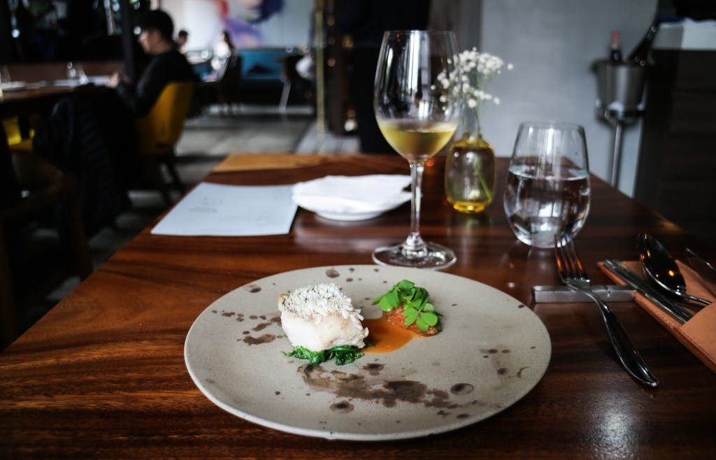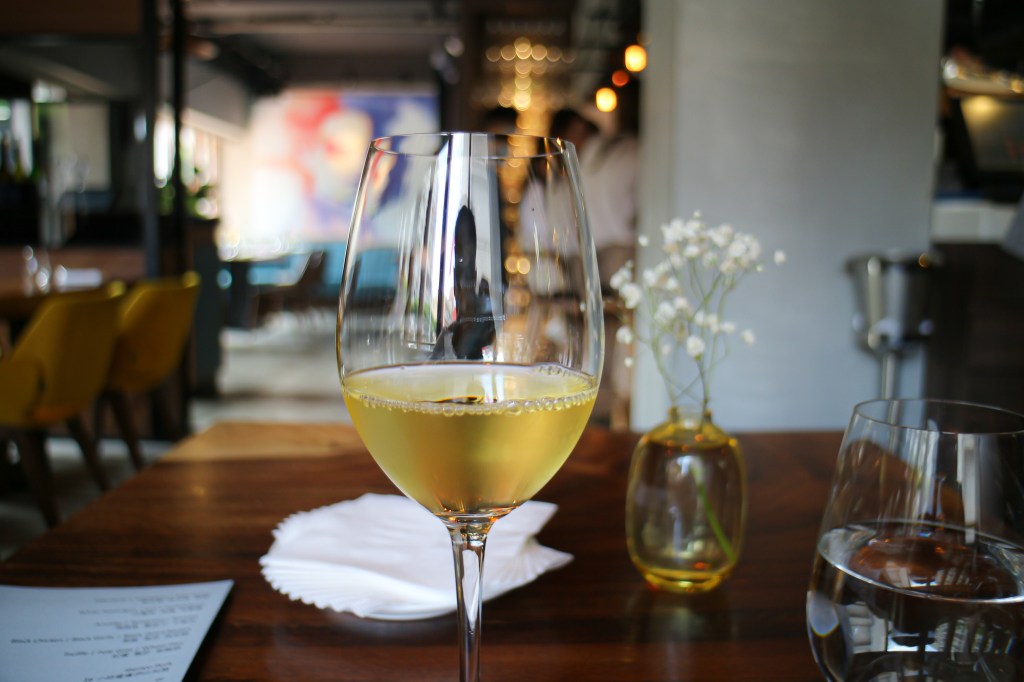 這款清爽的布根地氣泡酒,倒在餐廳精選的香檳杯裡,彈跳活躍的氣泡,冰涼冰鎮的氣霧瞬間包覆了酒杯。