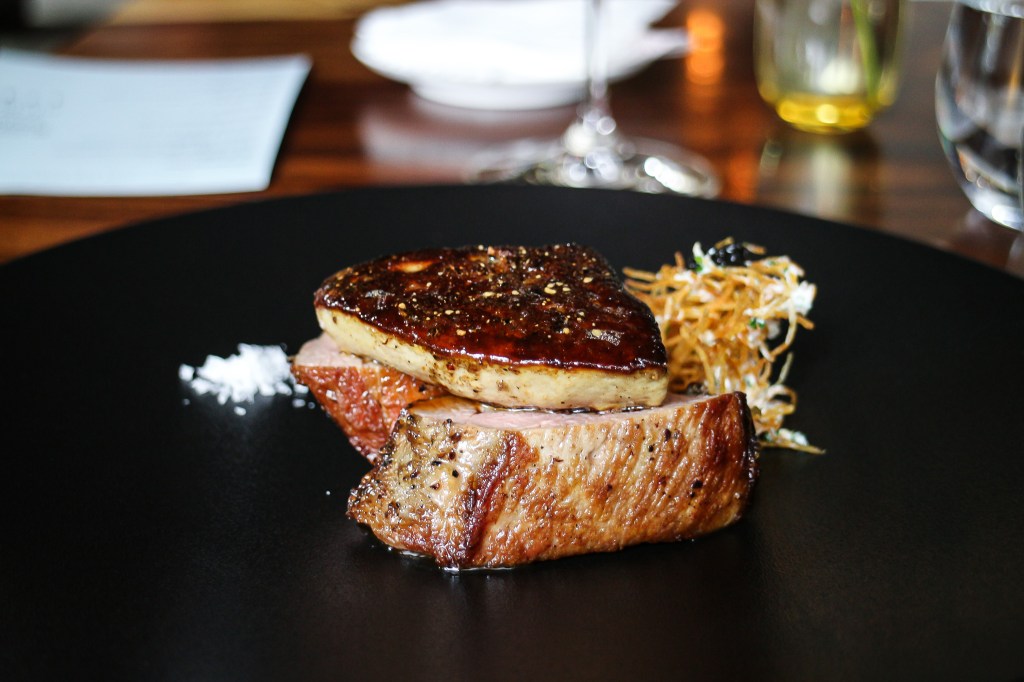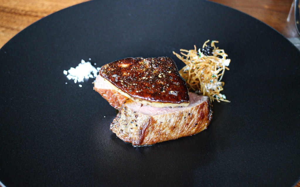 主廚還放上鴨肝,哇勒…頂級了,美味到不行,這我無法單吃,因為這樣就浪費了,搭再一起吃,爆香鴨肝油花以及豬肉帶來的嫩汁,雖然很想吃完一口後很想再搭一杯甜白酒。鴨肝、伊比利、我沾海鹽、我沾醬汁、再把一旁的炸麵下佐上,這口感像跳舞,這時我無法多形容,愛死了。