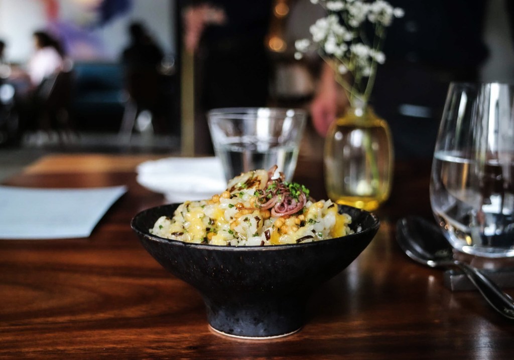 第七道料理是一款很有日本風味的食材菜色「螢烏賊、越光米、鰈魚」(Firefly Squid、Sole、Koshihikari)。