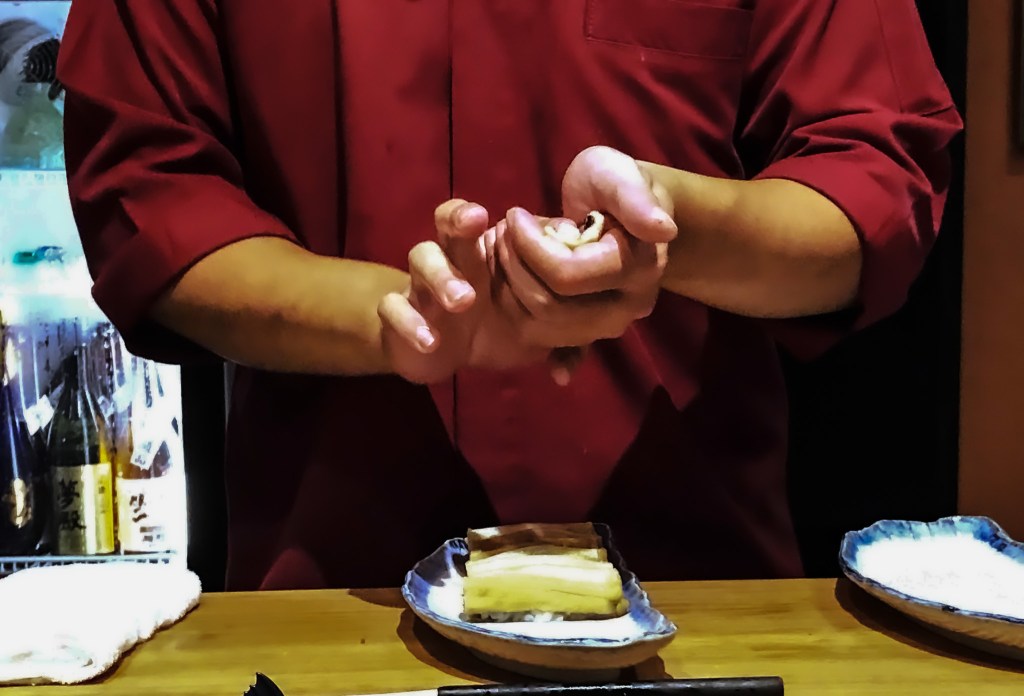 第六貫是為壽司是「星鰻」,看來逐漸進入尾聲了。這道取起送入口中,帶有微微溫熱感,入口舒適甜香,而黑醬稠甜綿密可口,儘管微緊實,但留下尾韻的甜美。