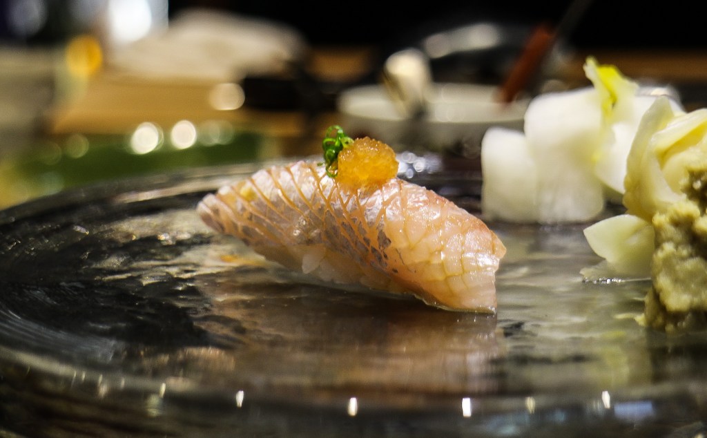 第三道是第一貫握壽司「黃雞魚」。這黃雞魚是微炙燒的黃雞魚,並搭上一點水果醋與點綴蔥,水嫩口感帶些酸甜滋味,魚肉緊實而後嫩不韌,溫醋飯組合的舒適。