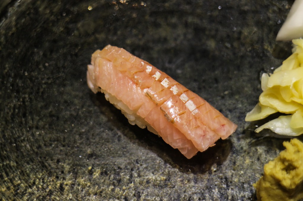 這一貫握壽司是臺灣野生的紅魽。經過師處理切片,送入口時咬合立即軟嫩,且帶些酸甜滋味,它與乾爽的醋飯相合,尾韻是香甜的感覺。