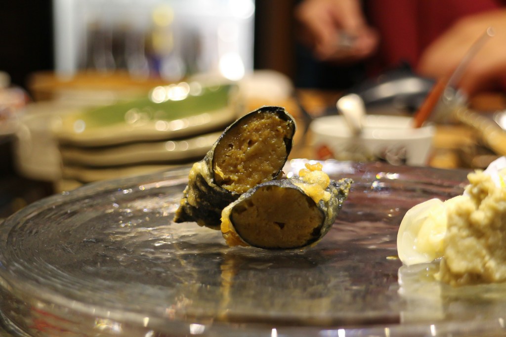 接著店家在上一道料理是炸物,竟然是炸海膽!!這外層的海苔似乎併鹽炸,而香酥的海苔味,咬和是一種感不到油耗的炸物,隨之而來是成塊的海膽味感,多咀嚼後海膽甜香露出,雖不如生食但絕對是熟食者之愛。