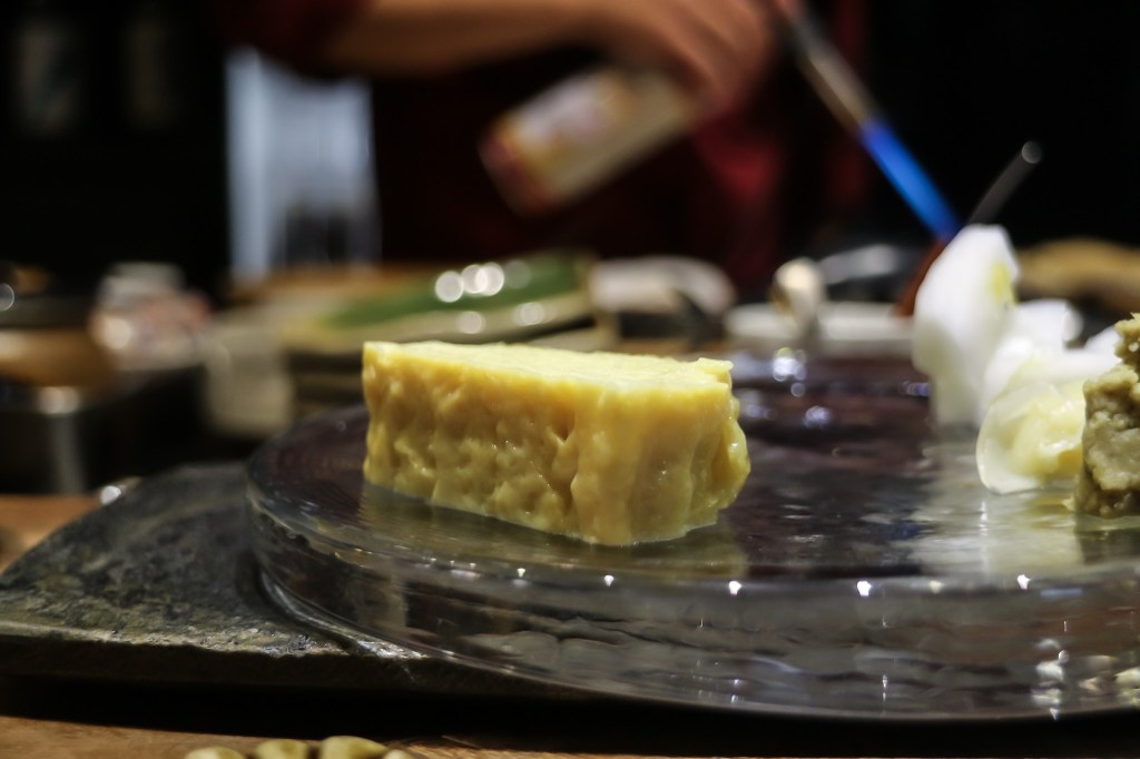 第十八道是最後小品「玉子燒」。這款傳統玉子燒帶著溫熱滋味,當然除了溫熱之外,其蛋汁甜香還有點點鹹口感,甜中帶鹹,質感理想。