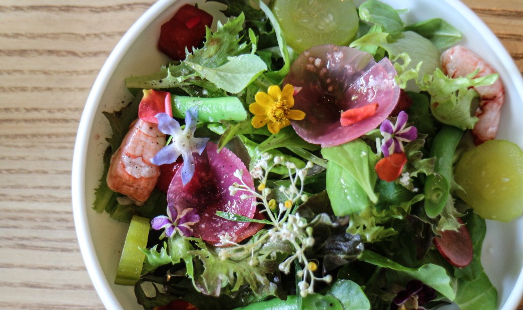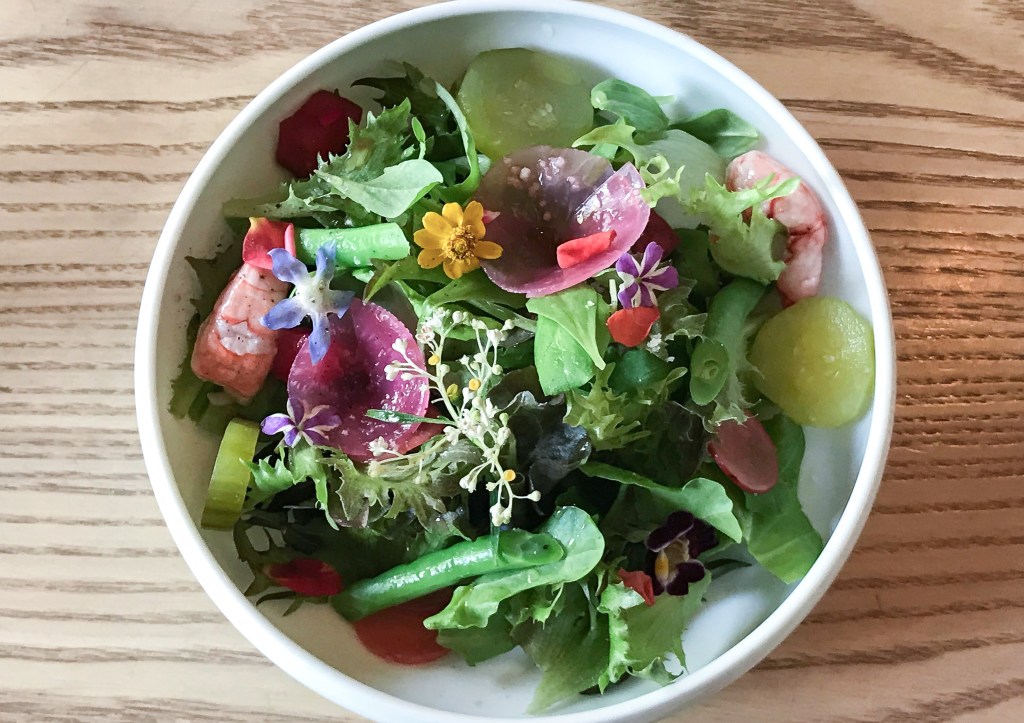 第一道耘夏樂沙拉。以台灣小農農場的生菜,有甜菜根、醃漬蘿蔔、小黃瓜、白花椰、小黃瓜的花嗎?