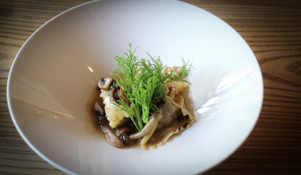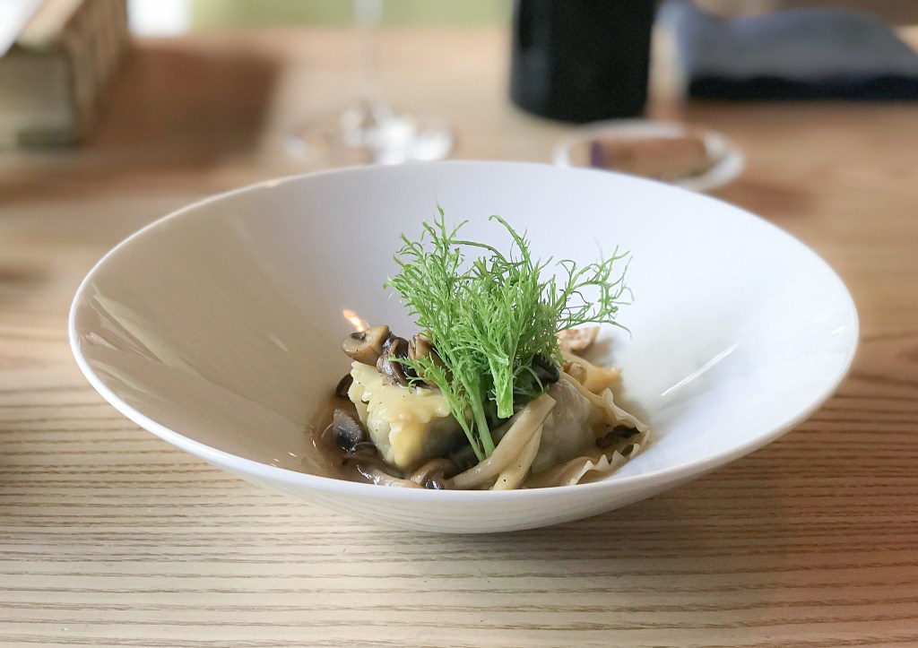 接著服務人員端進第三道菜「鴨香義大利麵餃」(Duck Ravioli、Chestnut、Walnut、Mushroom)。