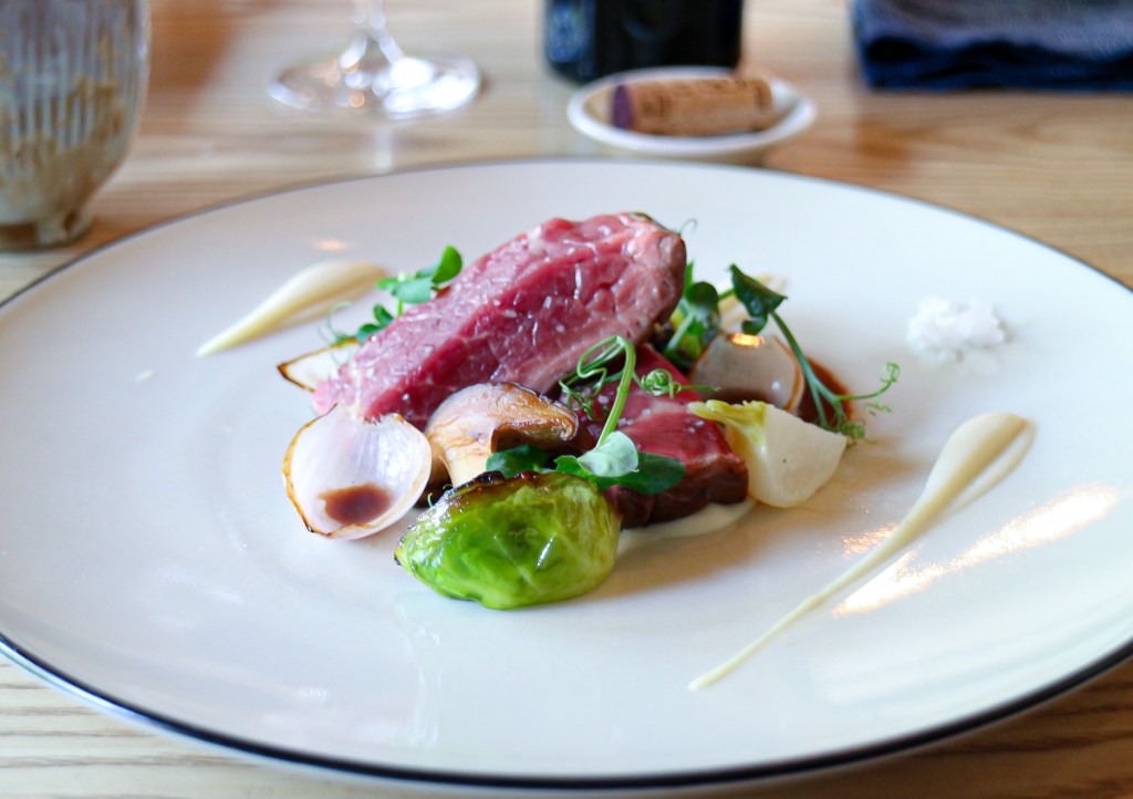 主餐牛肉是以低溫烹調雲彰牧場的臺灣母牛,還有些稻草煙燻,看來生食又像熟成,實感溫柔而微熟嫩,沒有任何鮮腥味,很棒的口感。除了先要直接吃,再搭來自長濱的原住民料理海鹽,這搭葡萄酒皆是美味可以辦婚禮了。