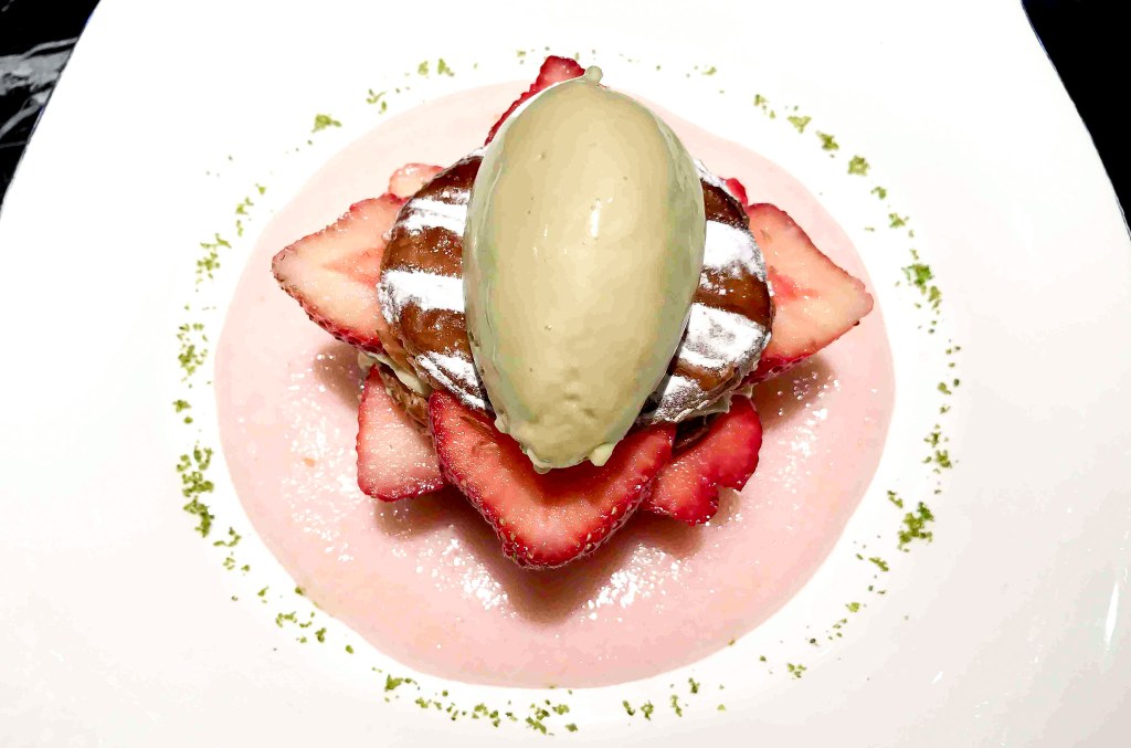 這道是一塊季節水果為主的「草莓千層派」,這塊我先給評價啊!!真的好吃的不得了。上層的開心果冰淇淋,才一口就將我一天沒網路而鬼打牆的努火心情解開而療癒了。
