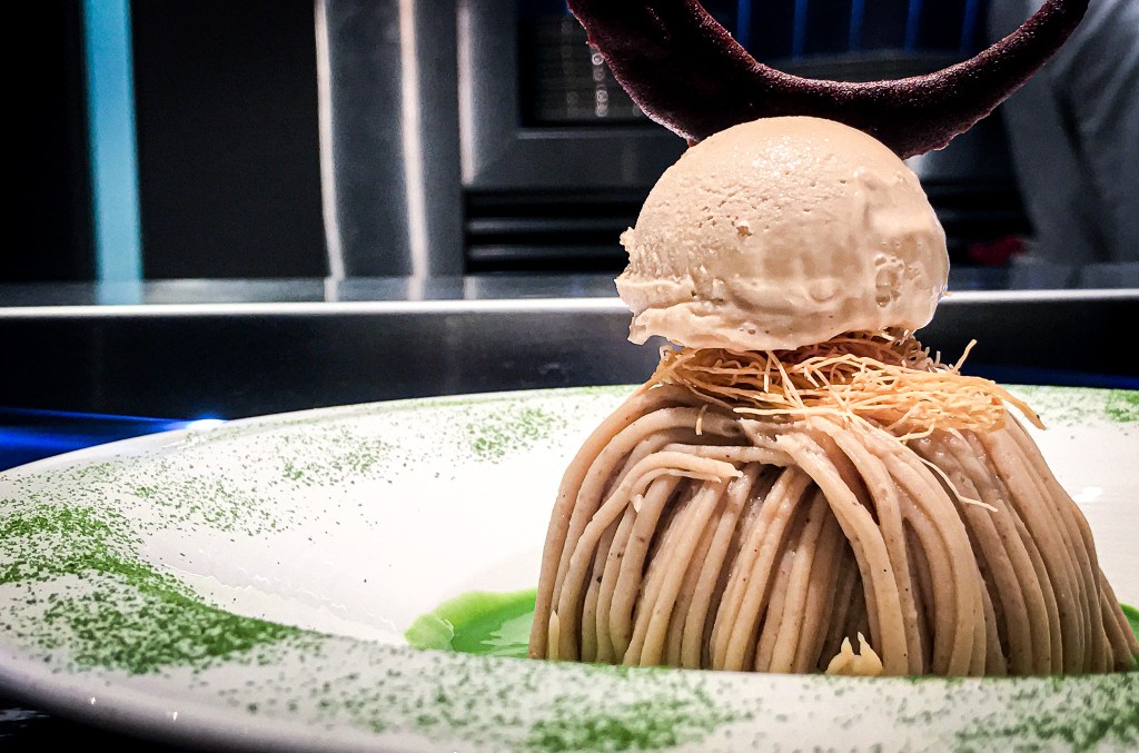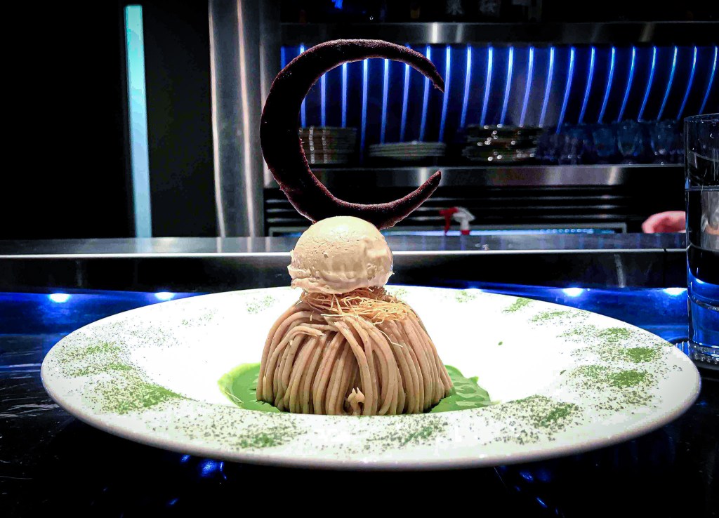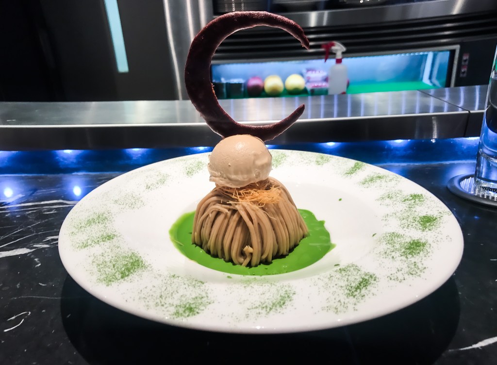 這次的冰淇淋是焙茶口味的,而上層是烤成彎月的巧克力餅,放在迷人好吃的栗子泥搭上,搭配對味的奶油,串疊起來就是一連串的美好。
