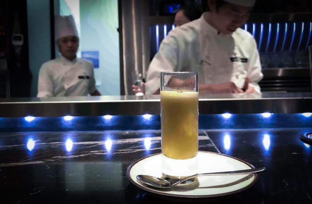 坐在位置上,除了一杯柔軟可口的冰水外,餐廳也附上一道開胃冷湯SOUPE CAROTTE POMME。