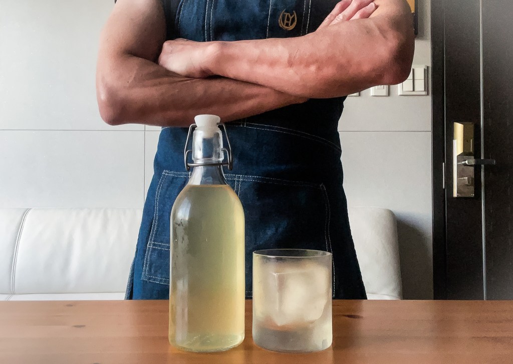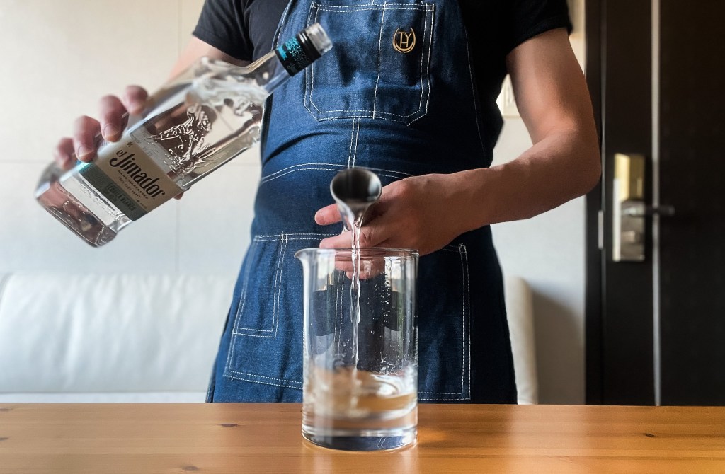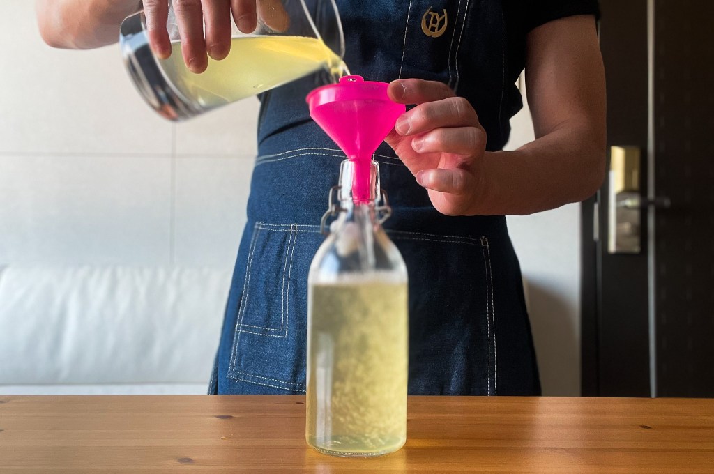 經過攪拌,然後注入瓶子裡,然後放進冷藏先冰鎮,再繼續完成這杯調酒。