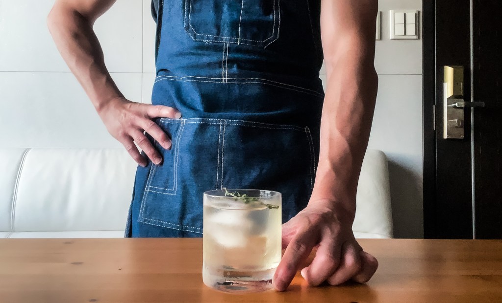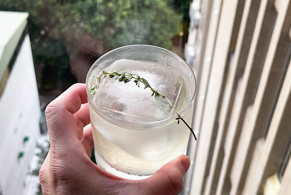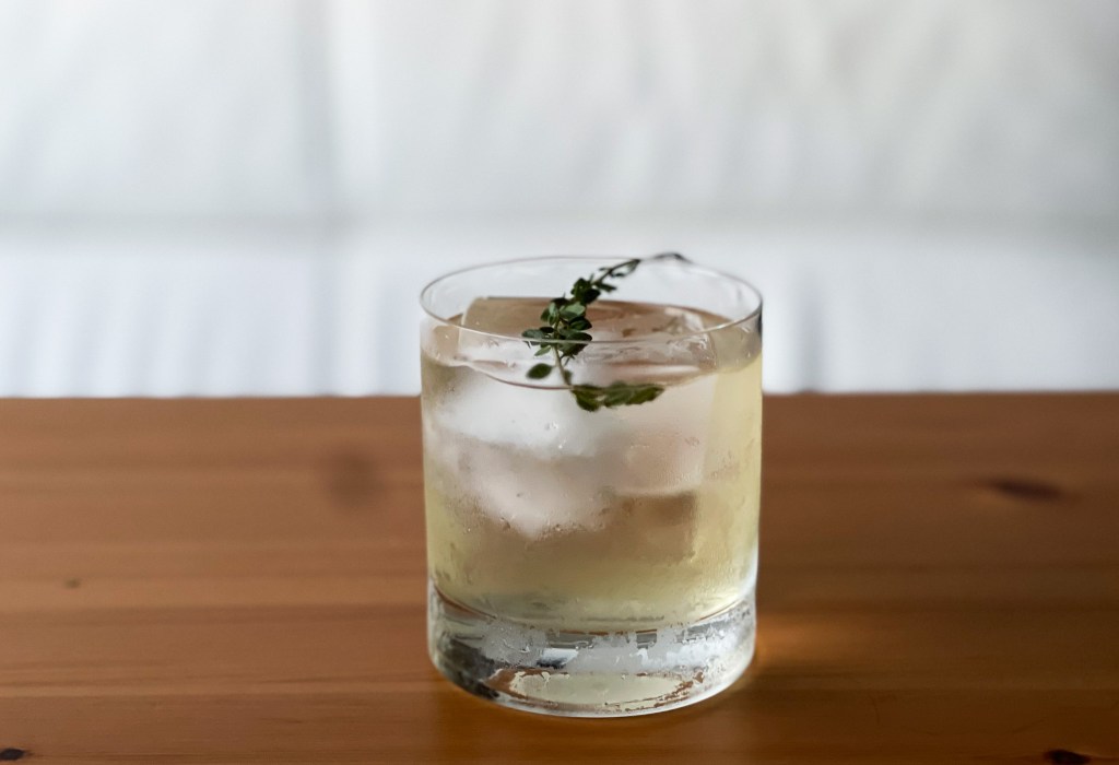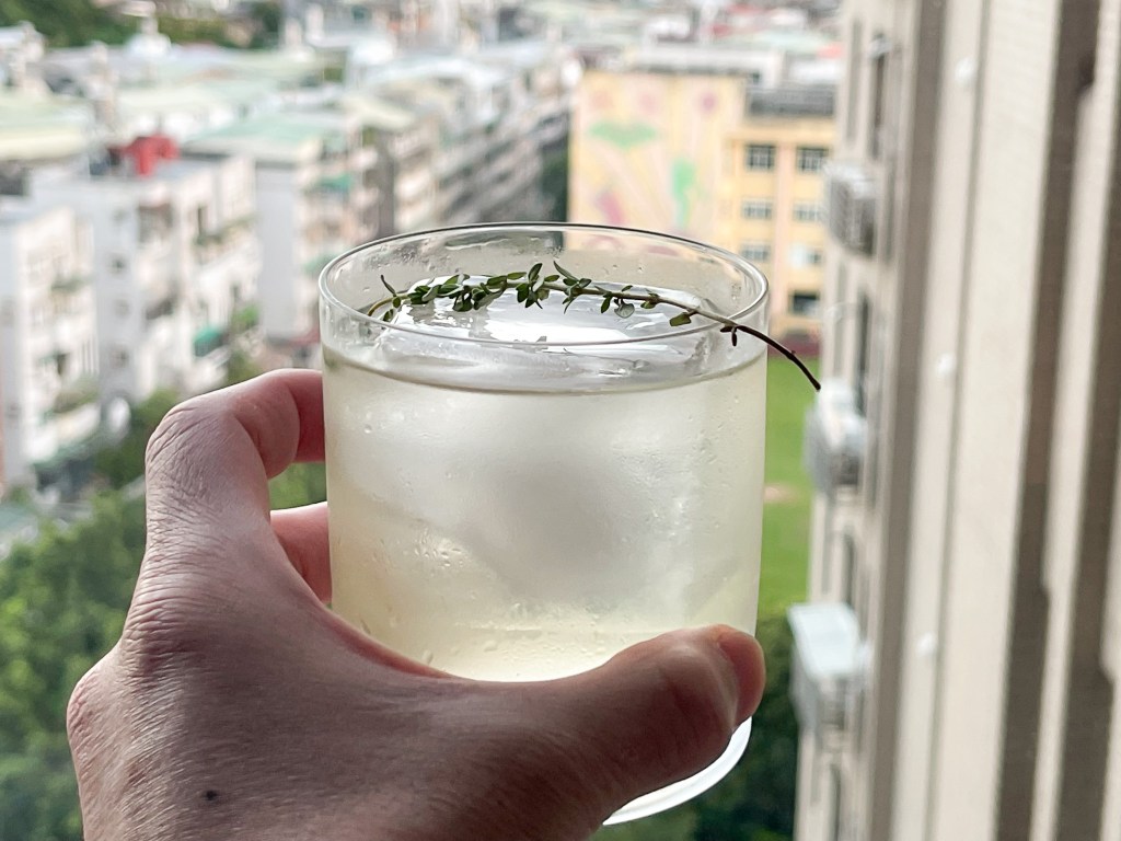 經過一個小時後,我將調酒取出,並準備一杯威士忌杯,然後取出方正冰塊,接著我將調酒注入杯中,然後搭配一樣很衝突的植物就是Thyme百里香,而完成這杯調酒。