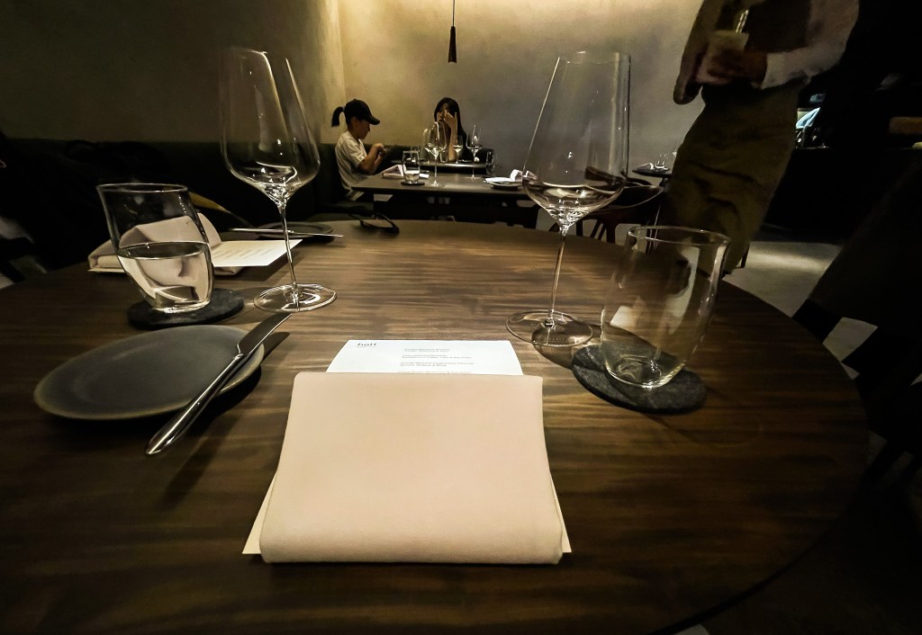 不過此時有個小插曲,就是兩個大男人對座於方桌,我倆雖著輕鬆的西裝外套,但總習慣背運動背包。於是服務人員發現了問題,幫我倆調整了位置,所以不是對座,這個動作有敲中我內心的想法與疑慮,所以也能歸類最近的美好事件之一。